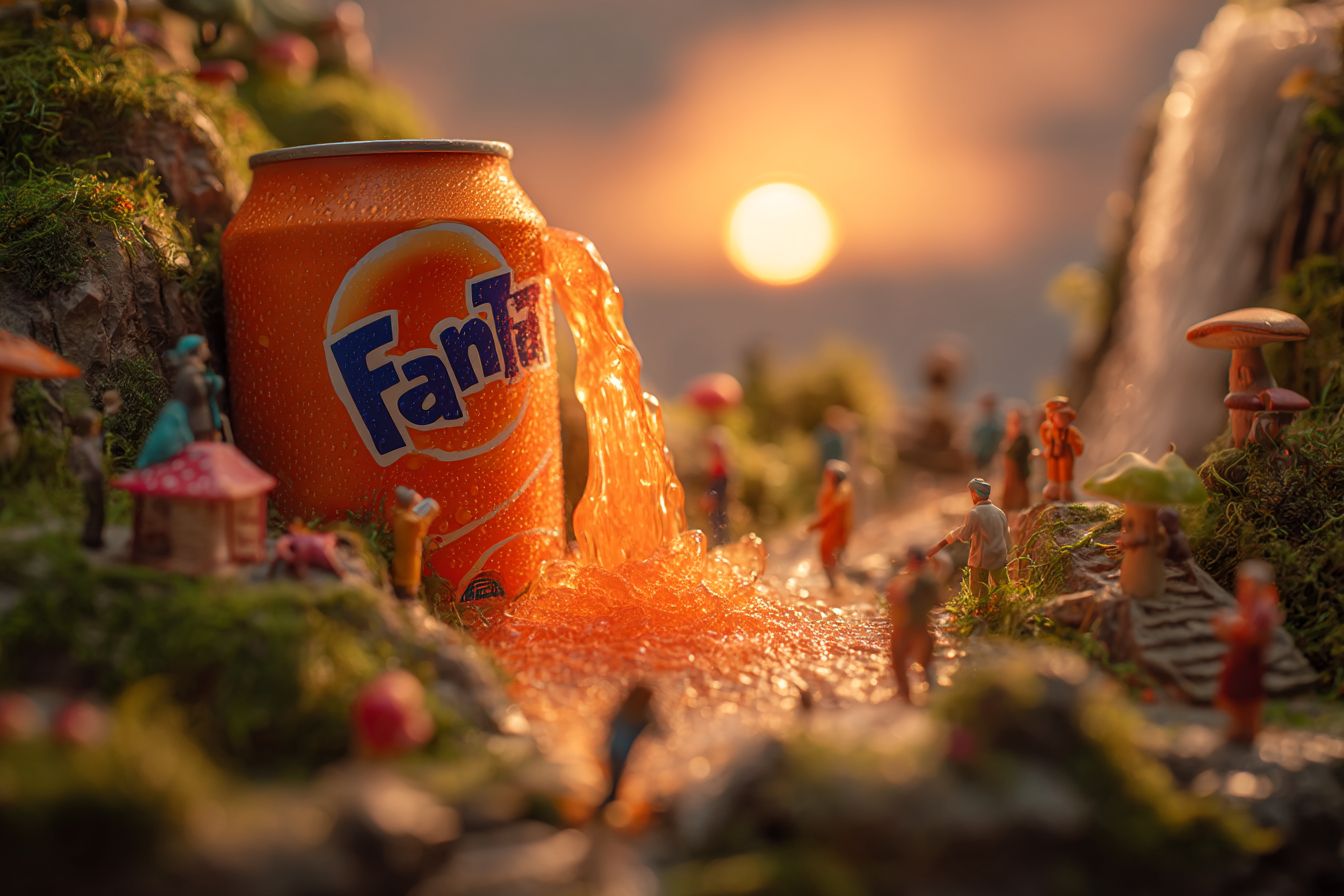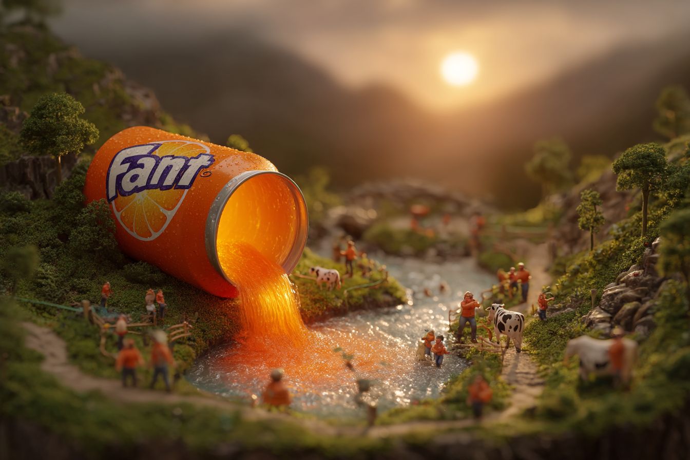 A giant Fanta can pours orange liquid like a waterfall through a miniature mountain landscape with tiny farmers, cows, and chickens interacting