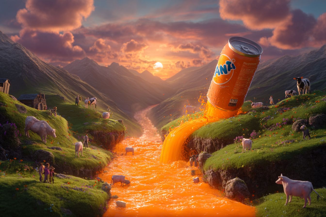 A surreal scene of a giant Fanta can pouring orange liquid like a waterfall through a miniature mountain landscape, tiny farmers, cows, and chickens playfully interacting with the glowing soda river, lit by sunset, cinematic tones, lush green hills, whimsical and magical atmosphere.