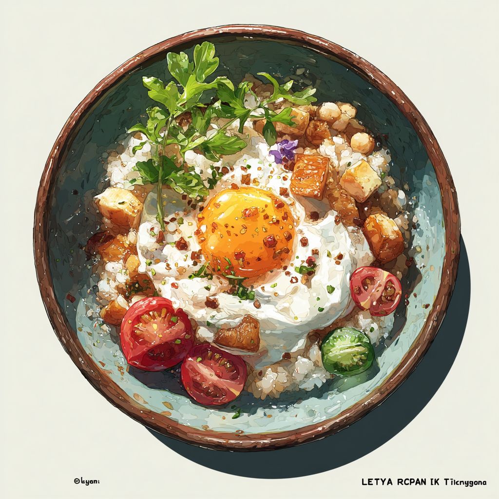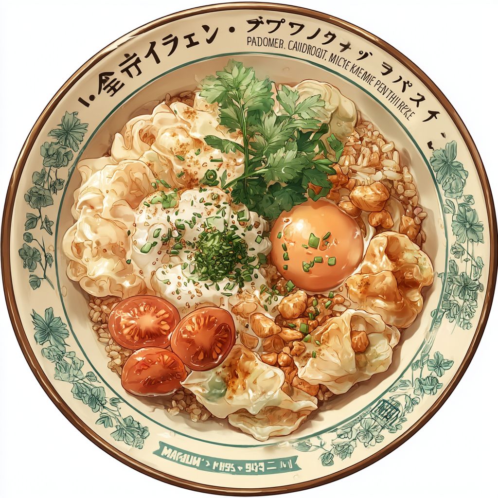 Japanese comics, top view, warm light, help me generate a nonsensical dish 'mixed rice' app icon, just the dish and the bowl itself, with a transparent background, generate in png format.