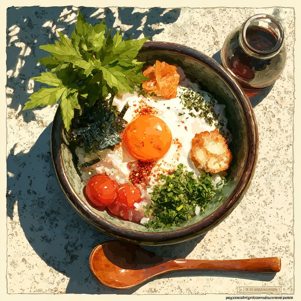 Japanese comics/manga, Top view, Warm light, Help me generate a nonsensical dish "app icon mixed rice", just the dish and the bowl itself, with a transparent background, generate in png format. --ar 1:1 --stylize 250 --v 7.0