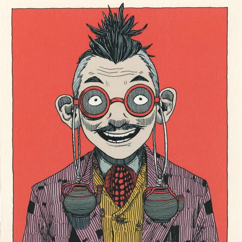 draw a mascot for tea, the character has huge glasses like a professor's, but instead of glasses there are two spinning tea bowls, a wide kind grin from ear to ear, Asian appearance --sref 1803718622 --sv 4 --v 7.0 --p u4rmxcf