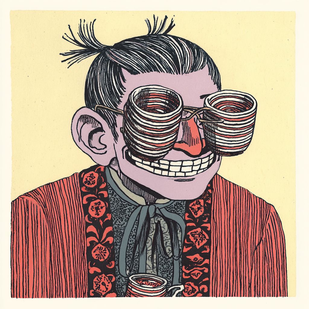Draw a mascot for tea, the character has huge glasses like a professor's, but instead of glasses, there are two spinning tea bowls, with a wide grin from ear to ear and an Asian appearance.