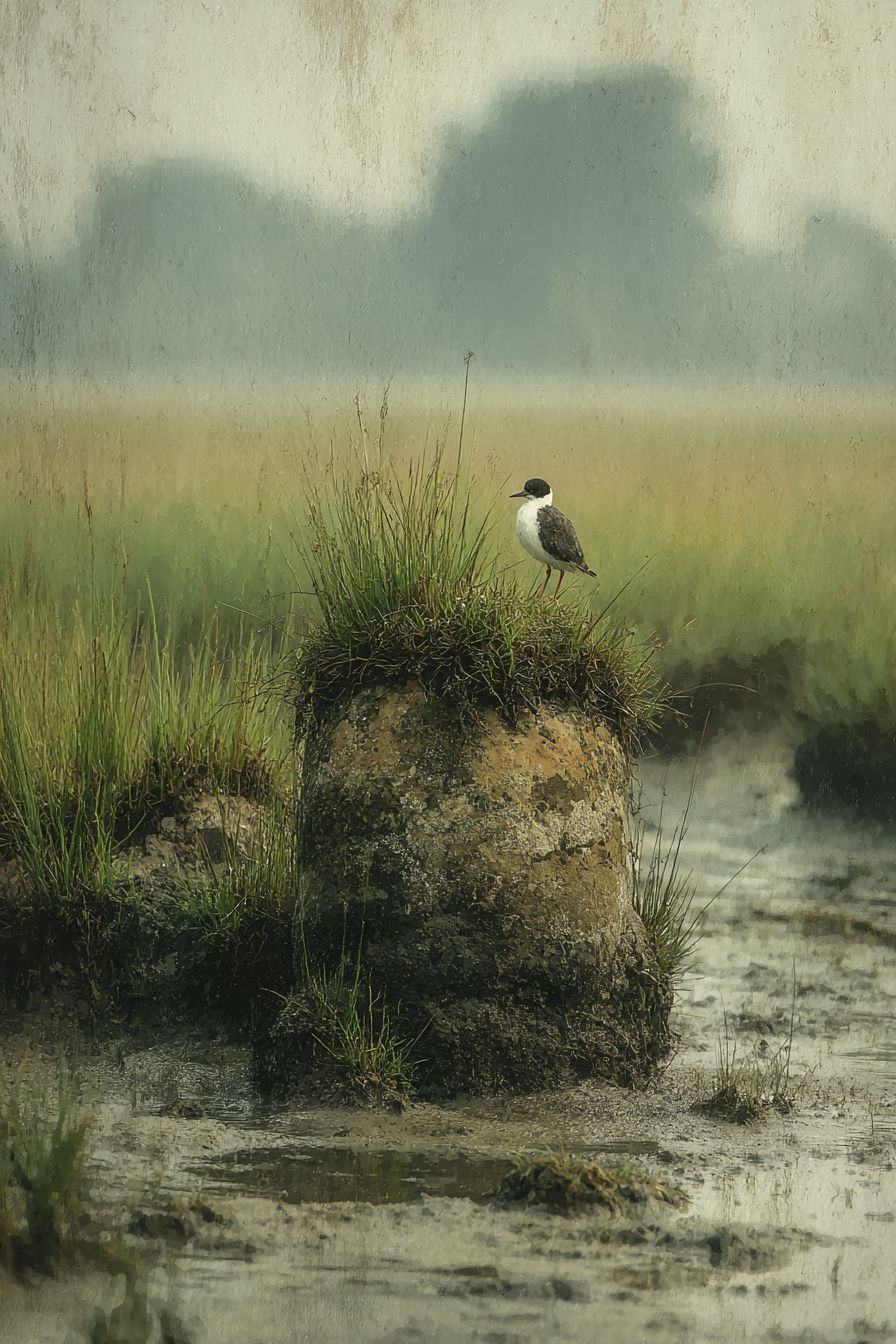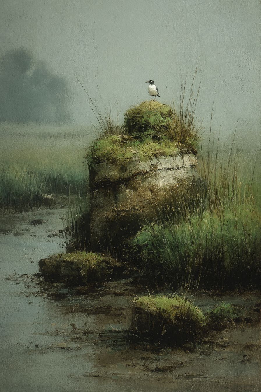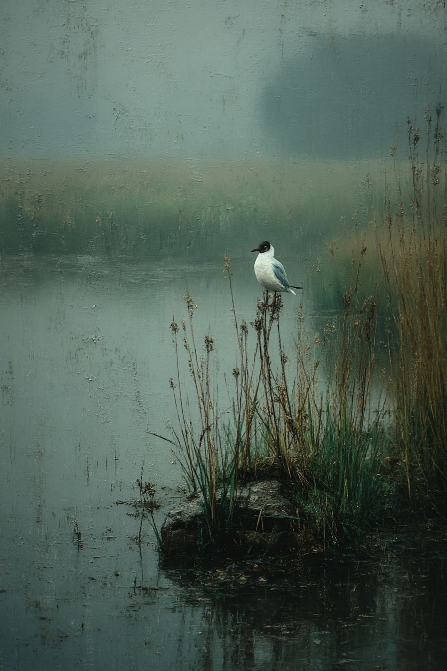 In the misty morning, there is an isolated island in the middle of shallow water with reeds and grass on it. A black-headed gull perches on top of one of them. The background features a blurry marshland. miniature painting --chaos 5 --ar 2:3 --raw --stylize 300 --v 7.0 --p u4rmxcf