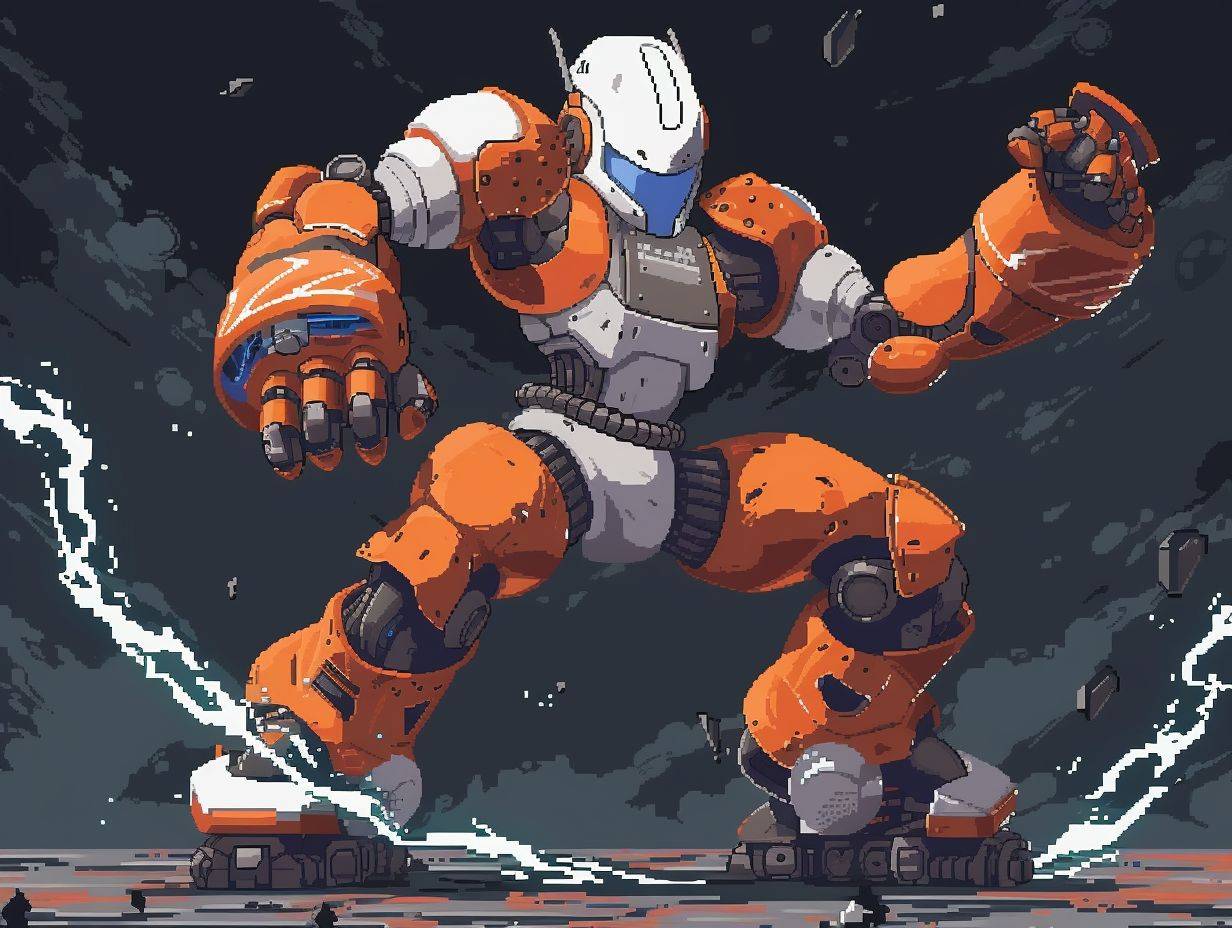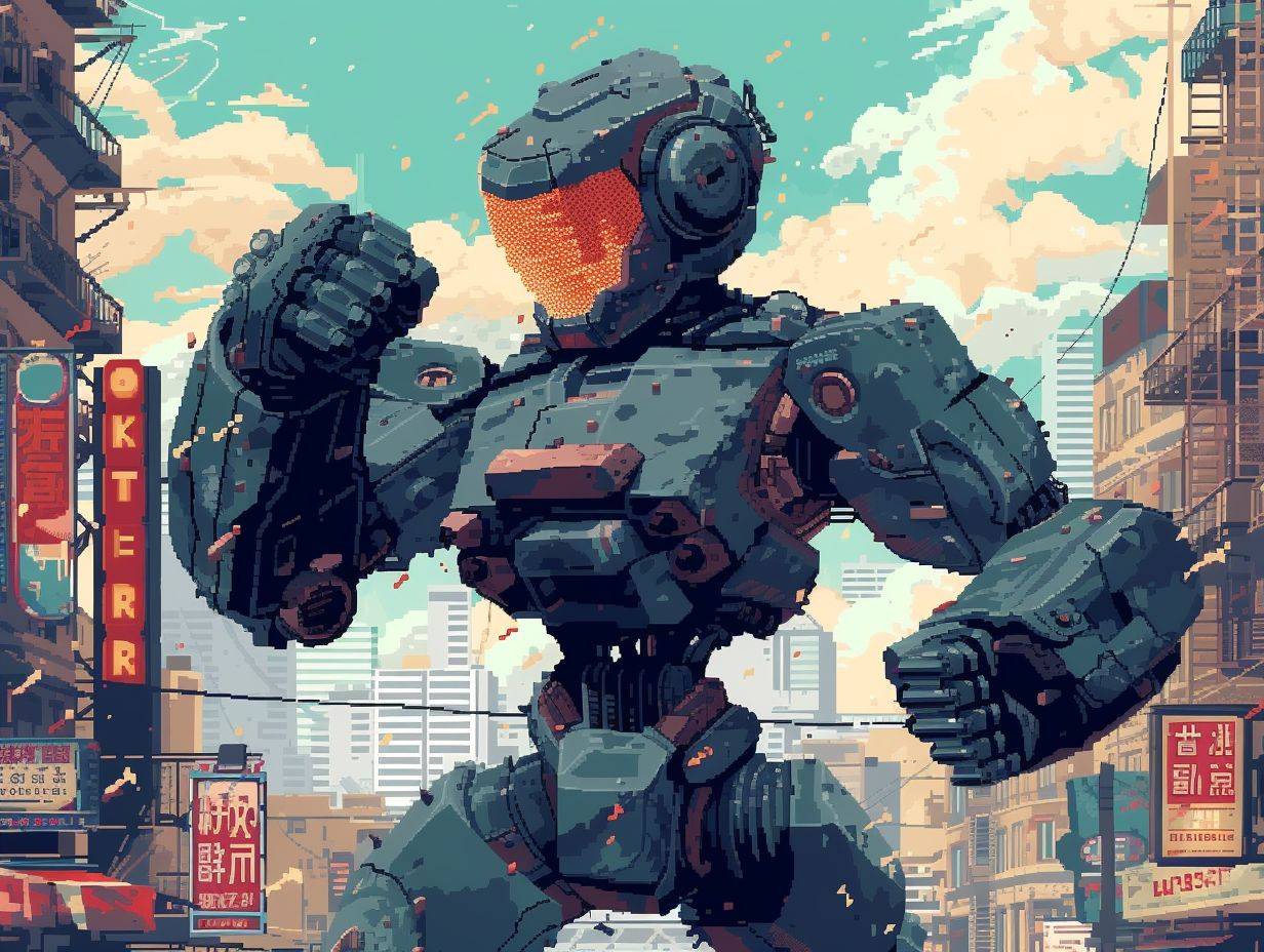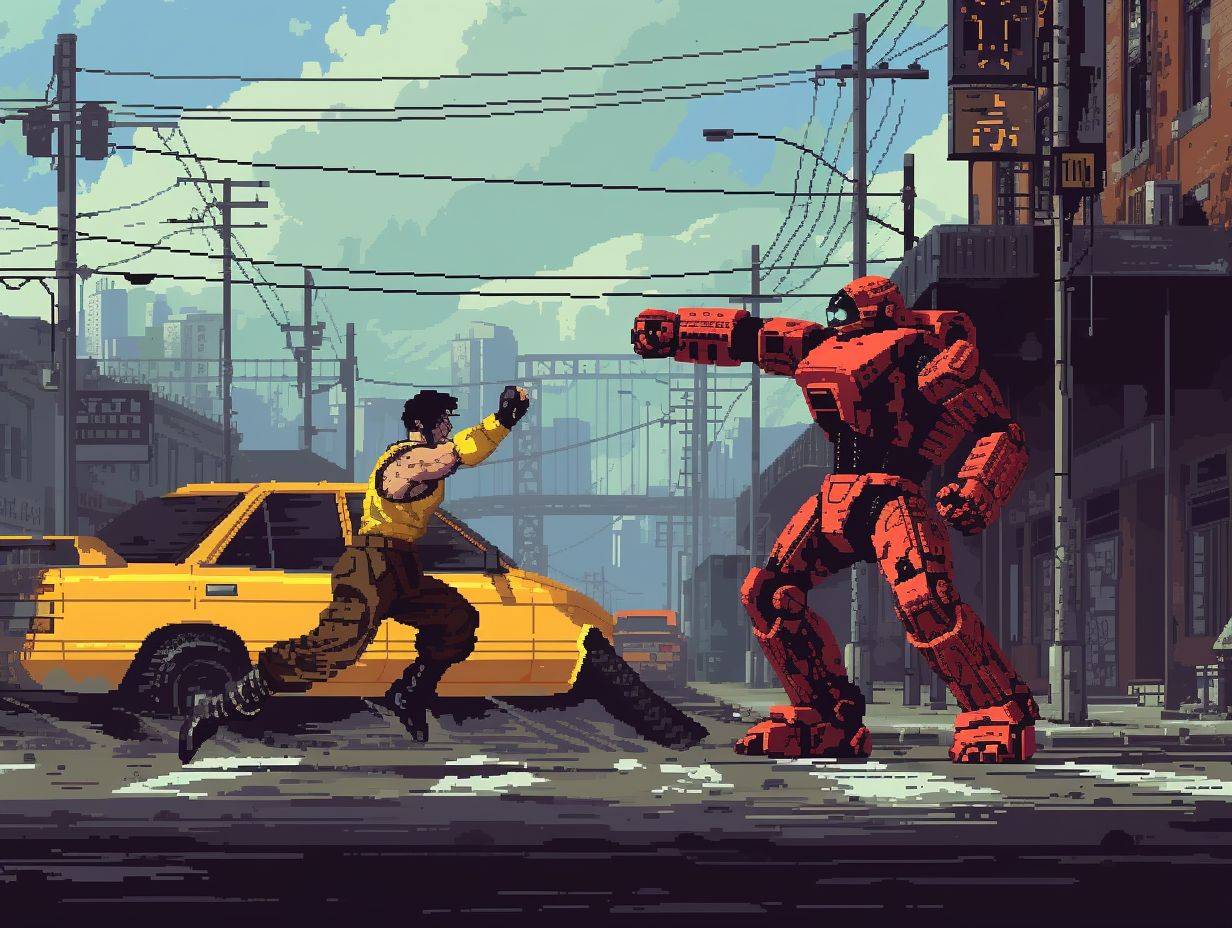 Pixel art, 2D game art, artificial intelligence robot as a Street Fighter character, dynamic pose.