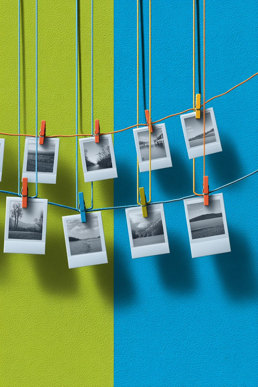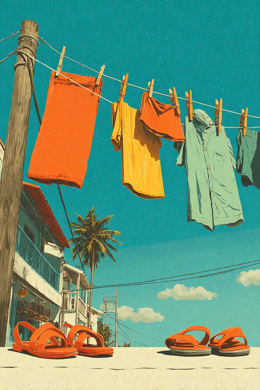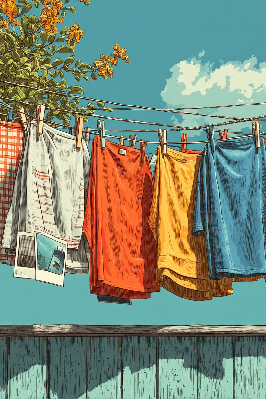 Graphical drawing of polaroid photos hanging on several clothing lines in hot summer weather. Green and blue background. Flat design. --chaos 5 --ar 2:3 --raw --stylize 300 --v 7.0