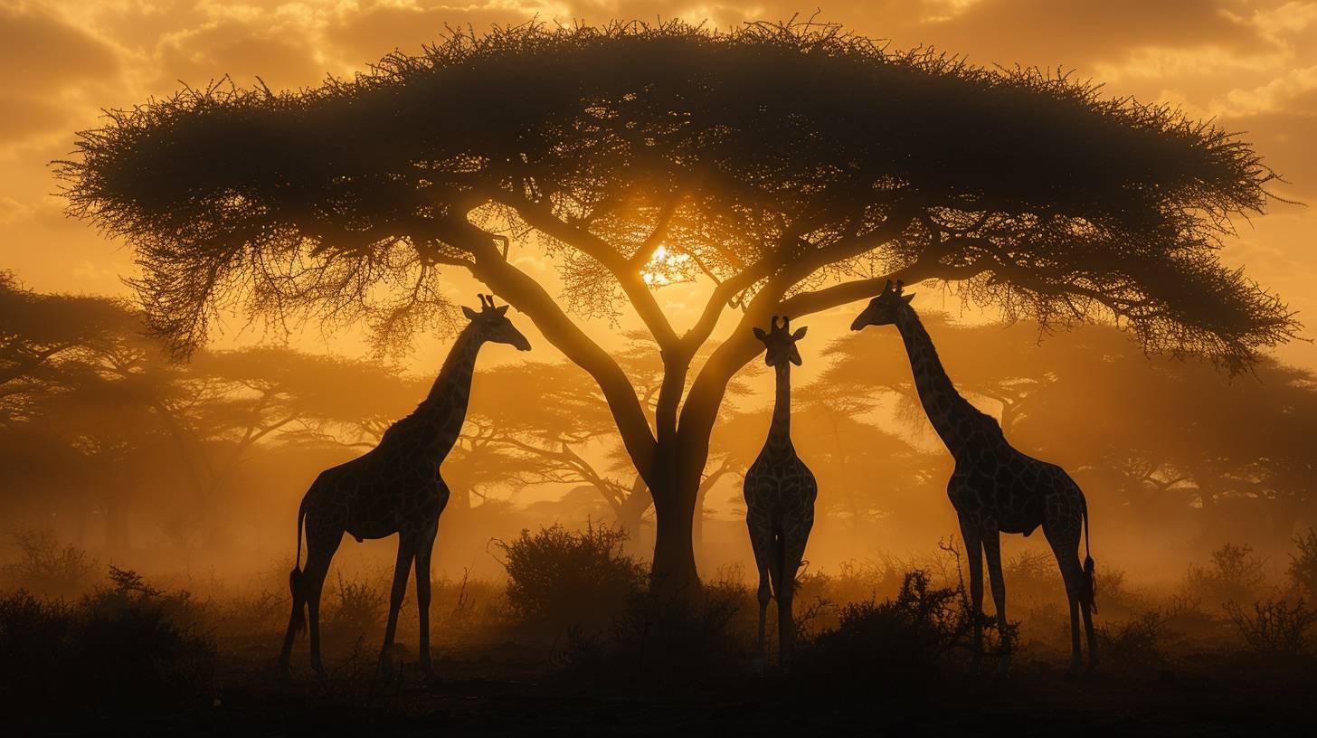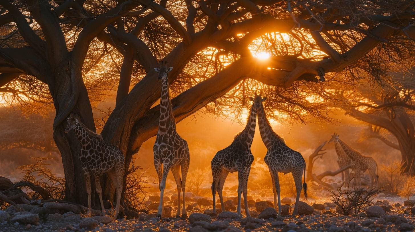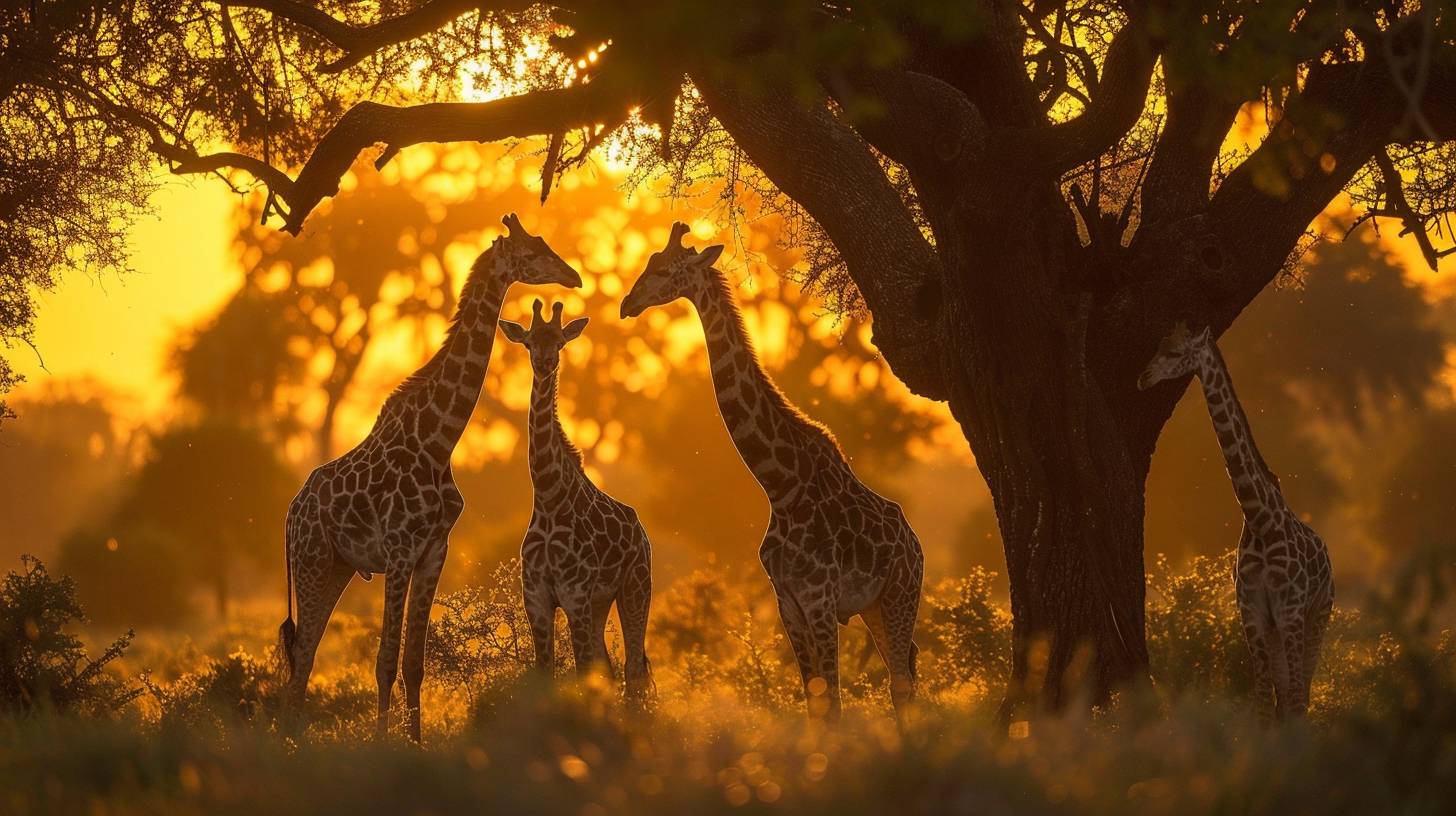 wildlife photo of a group of giraffes, standing under a tree, backlit --ar 16:9 --style raw --stylize 200 --v 6.0