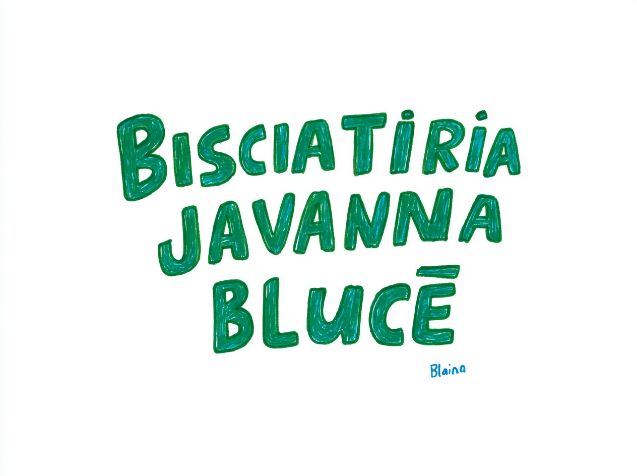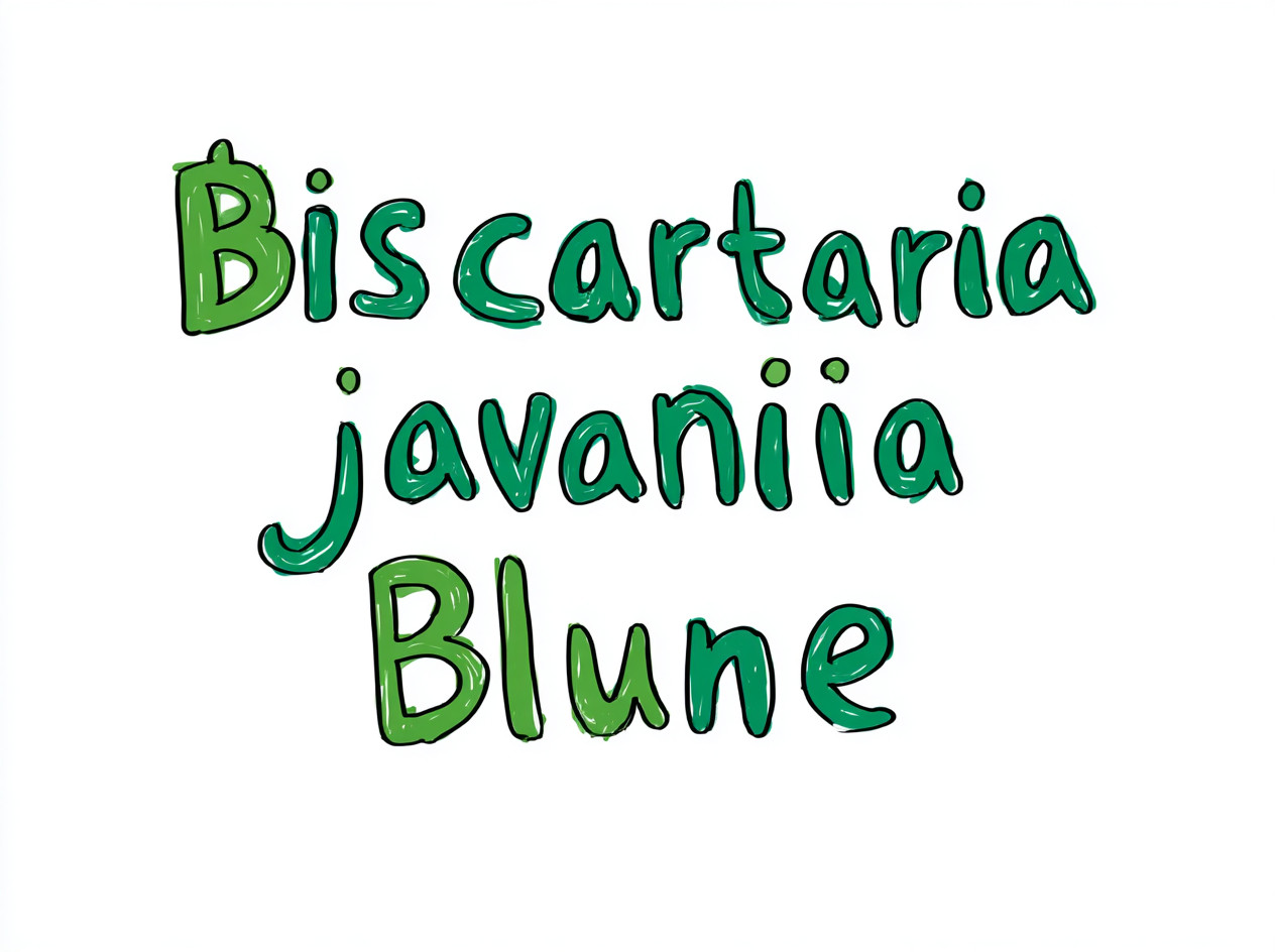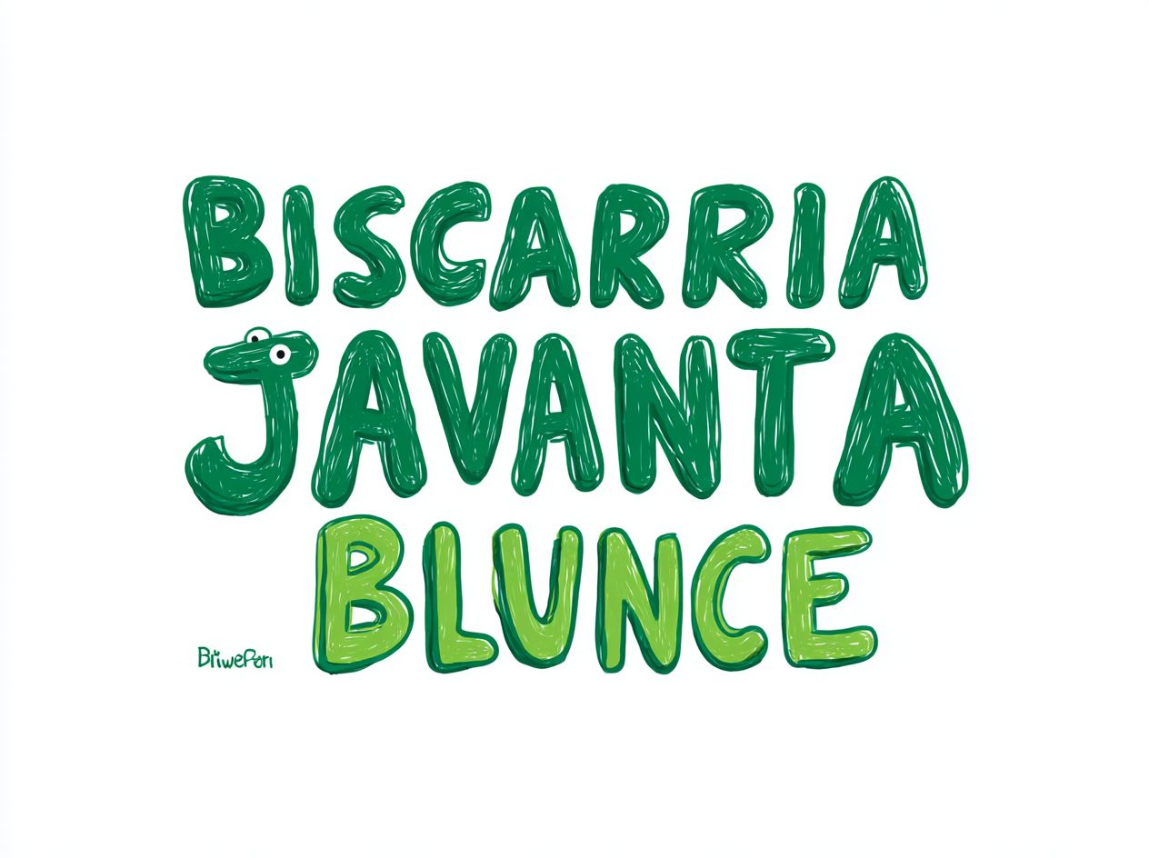 A simple, colorful drawing of the text 'Biscuitaria javnica Blume' written in green marker on white paper. The name is displayed in bold letters with an outline that resembles the shape and head of Baba's crocodile toy from the Bluey series. There's no background, just pure color. It has a playful vibe, suitable for children or cartoon characters. This design would be appealing to kids who love the Bluey series and its animation style. Vector illustration, clip art.