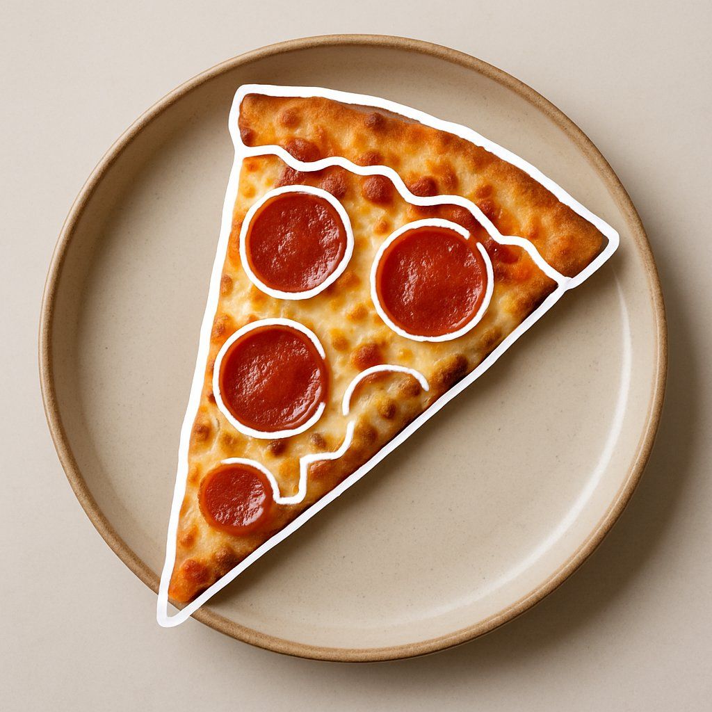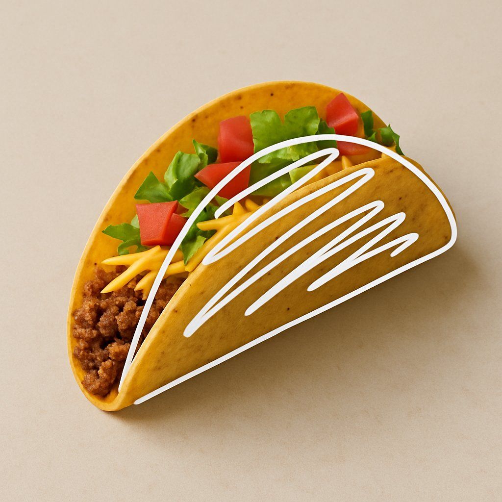 A high-resolution, photorealistic image of a cheeseburger served on a ceramic plate, with a bold white line-art doodle of a burger drawn directly over it, matching the bun, patty, lettuce, and cheese. Playful and slightly off-kilter.