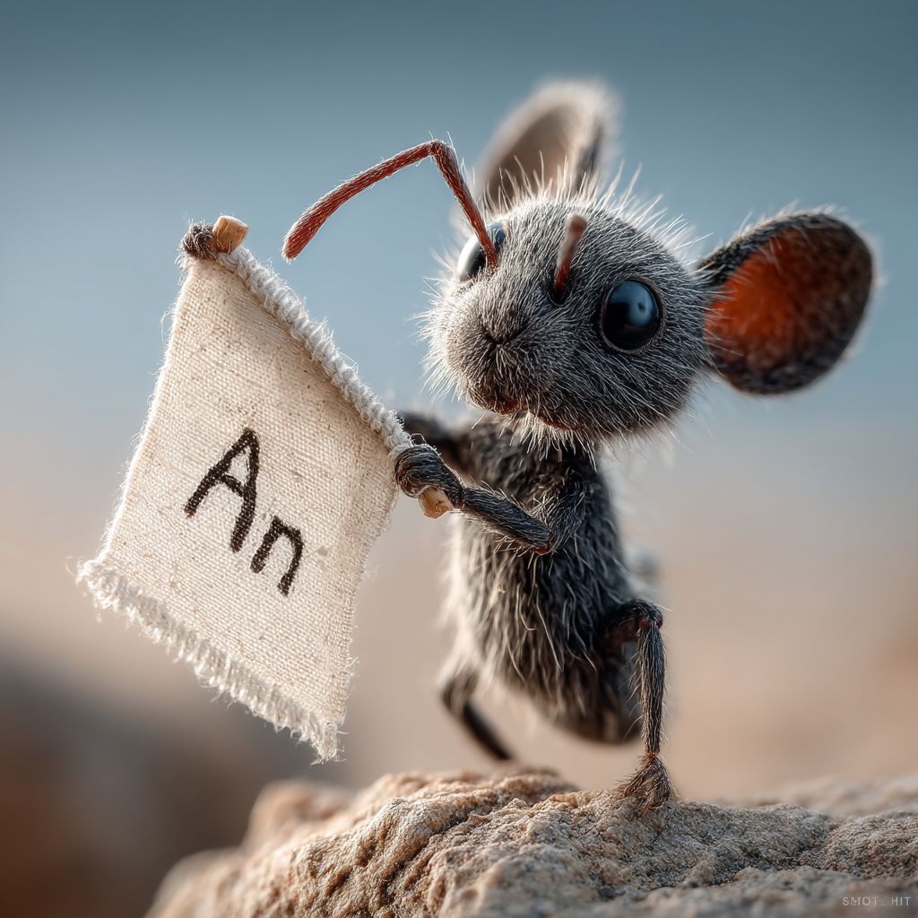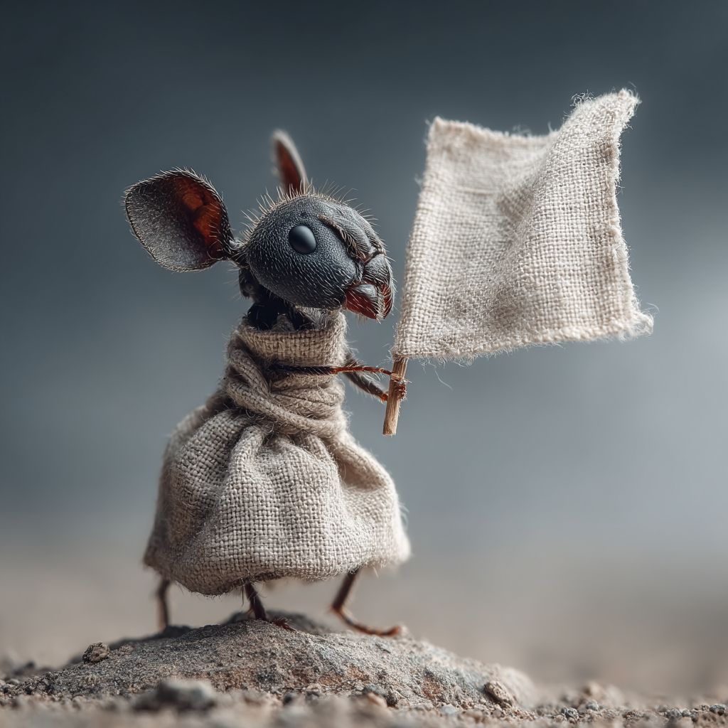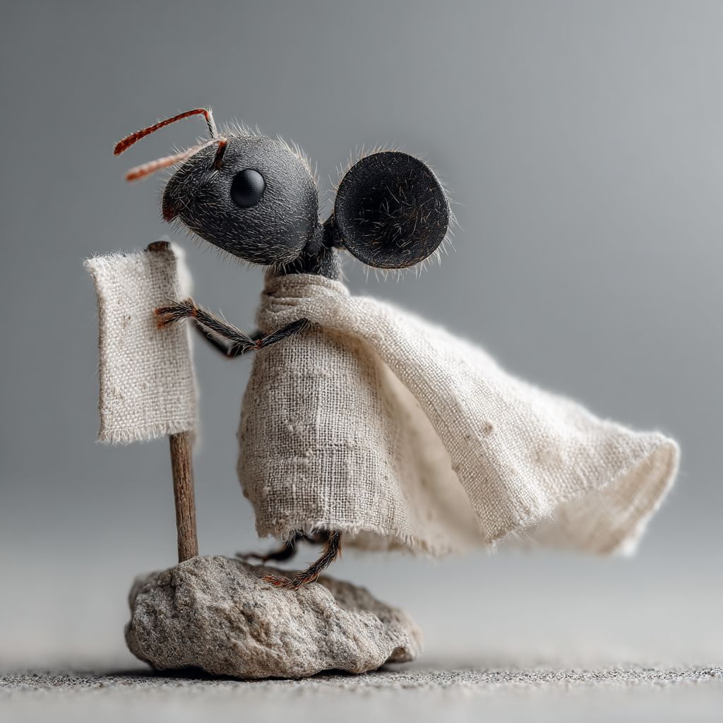 A photorealistic black ant standing upright on a rock holding a white fabric banner