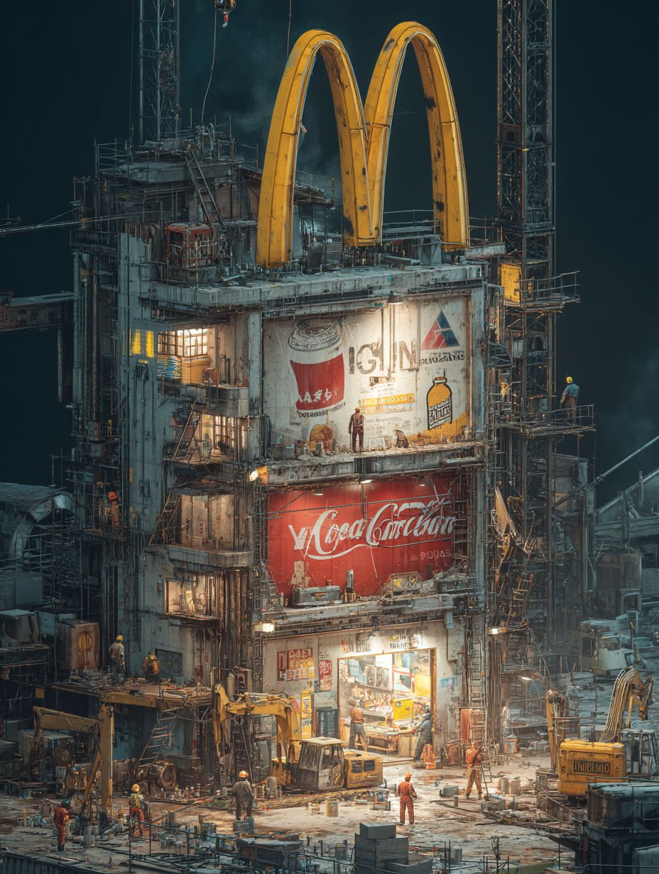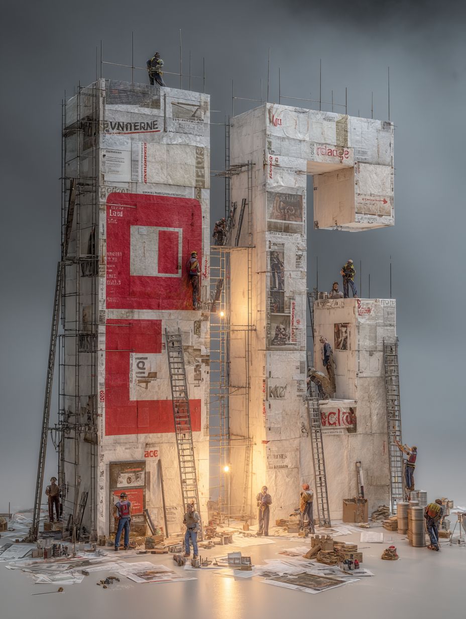 A hyper-realistic photo of the back side of a glamorous fashion Paper magazine cover, you can see some pages and a thick cover, like Vogue magazine, where construction workers and creative professionals are physically building and assembling iconic brand logos like McDonald’s, Adidas, Nike, and Coca-Cola. The logos appear halfway completed, with scaffolding, cranes, ladders, and workers in overalls attaching parts of the letters. The magazine is oversized and stands upright like a billboard. The lighting is cinematic, with a mix of backstage realism and glossy editorial feel. The scene suggests that behind every successful brand is hard work, data, and people. Dust, blueprints, studio lights, and camera gear are scattered around, DSLR photography, cinematic, 8k --chaos 10 --ar 3:4 --stylize 200 --v 7.0