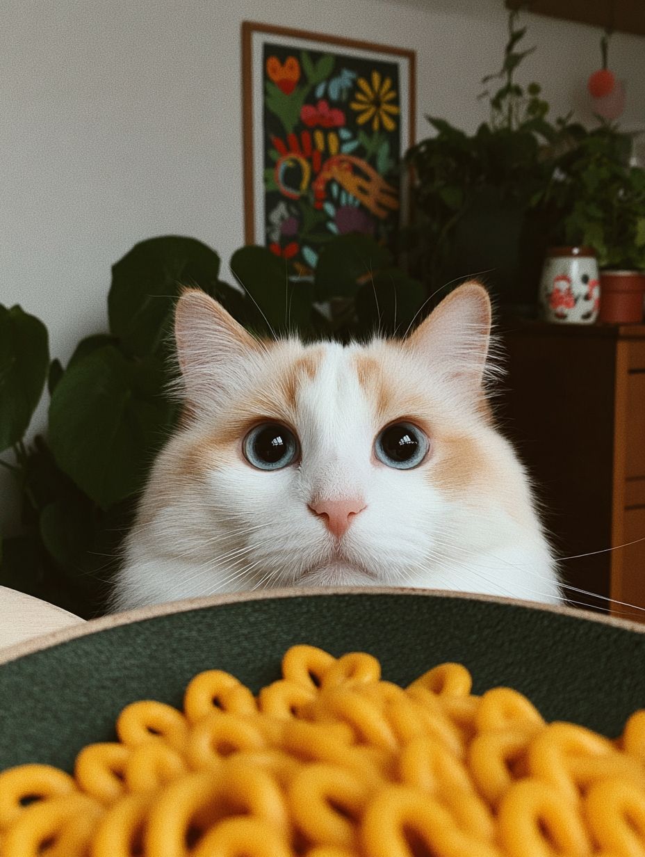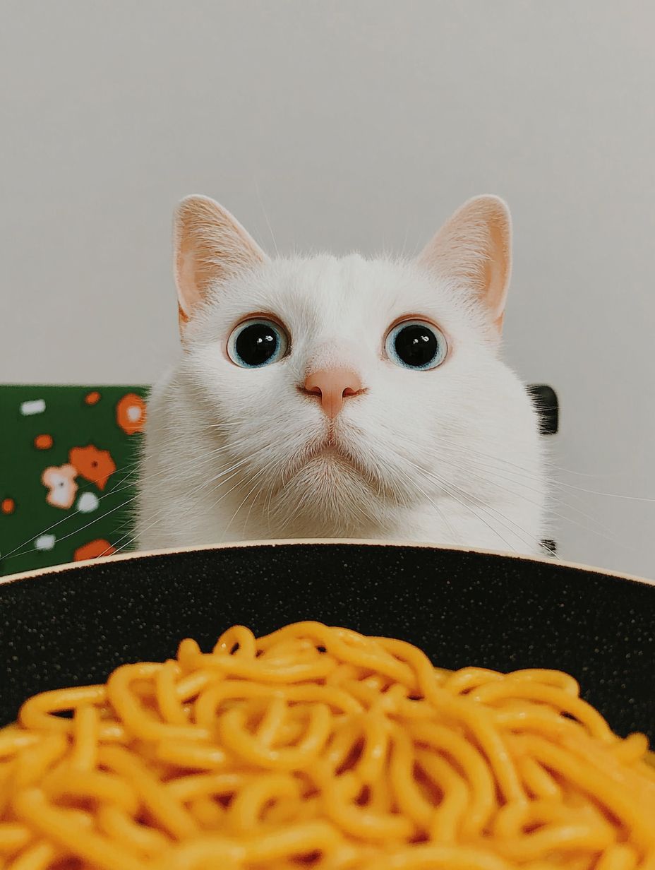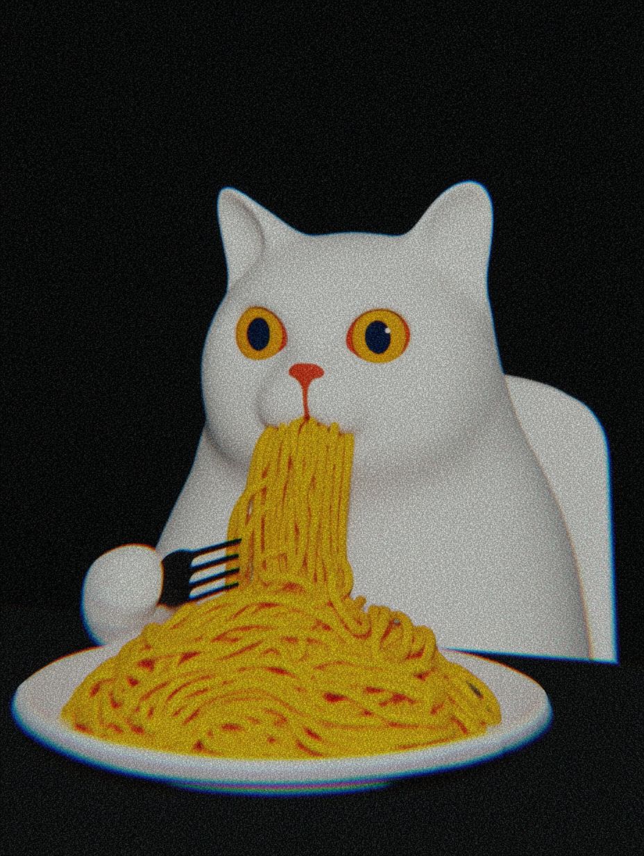 white cat with blue eyes is sitting on a white chair at a white table, eating spaghetti with souce with a fork held in its paw from a white plate. The camera angle should be slightly above, showing the spaghetti with souce in the plate. In the background, there is a white wall. The image should only consist of these elements with nothing else present. --chaos 20 --ar 3:4 --sref 1686876320 --profile 29poq4o --sv 4 --v 7.0 --s 250