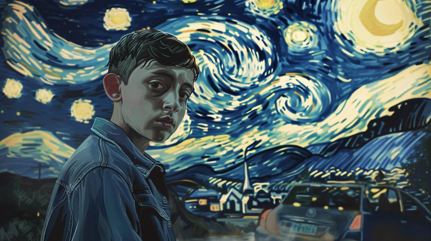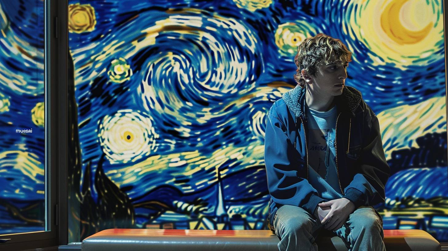 A magazine cover where the image of Sam from the Atypical series is combined with the background of Van Gogh's starry night, which has the title "musesai". Keep it simple, it's for a short film --ar 16:9 --v 6.0