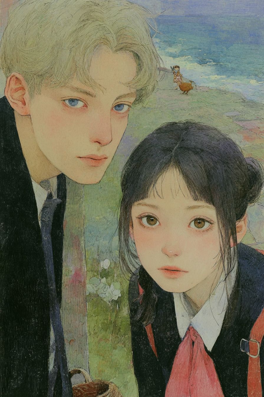 A handsome young man of Asian appearance similar to Jungkook from BTS with blond hair and blue eyes. Next to him, a beautiful young girl of Asian appearance with dark hair gathered in her tail and brown eyes. She is dressed in school uniform. Against the background of the coastal Korean city. Image in the style of Korean romantic dramas --ar 2:3 --sref 3434995313 --sv 4 --sw 700 --v 7.0 --s 750