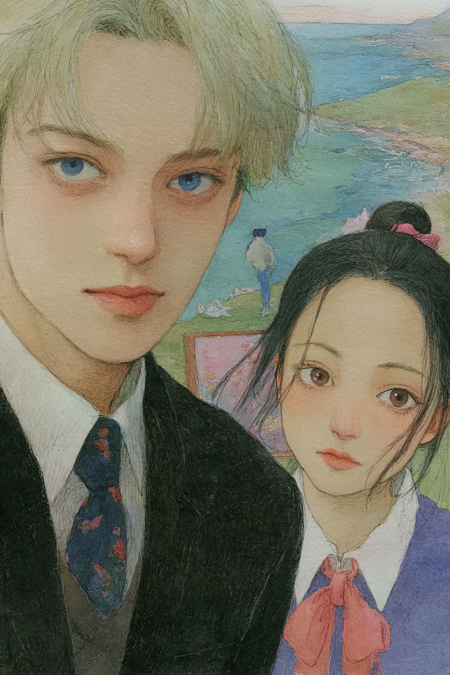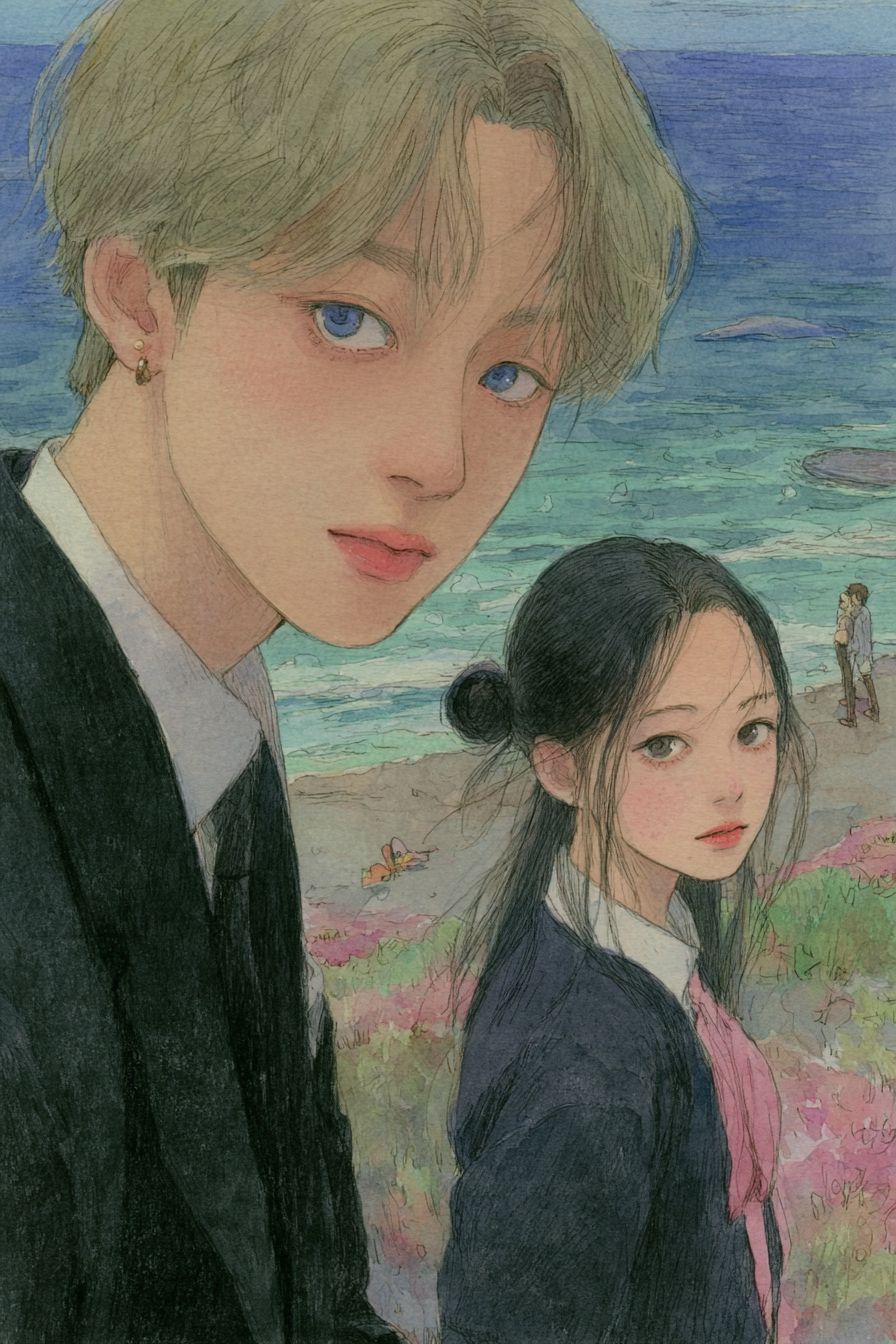 A handsome young man of Asian appearance similar to Jungkook from BTS with blond hair and blue eyes. Next to him, a beautiful young girl of Asian appearance with dark hair tied in a ponytail and brown eyes. She is dressed in a school uniform. Against the background of a coastal Korean city. Image in the style of Korean romantic dramas.