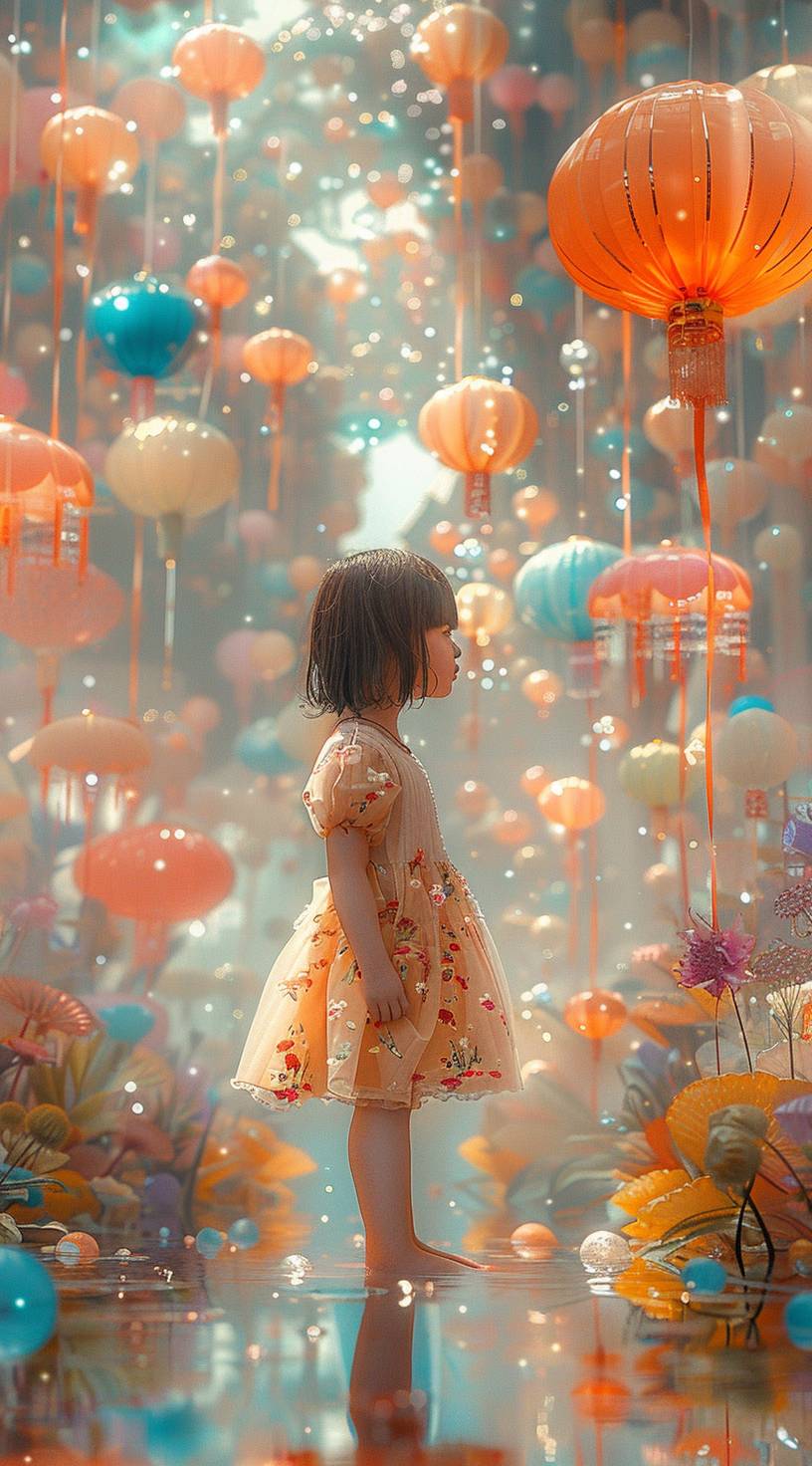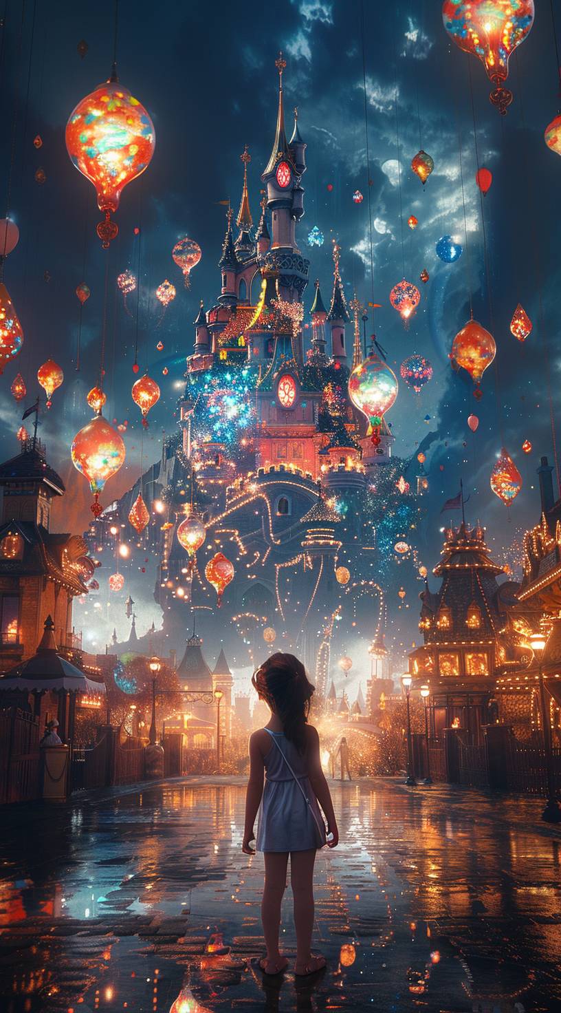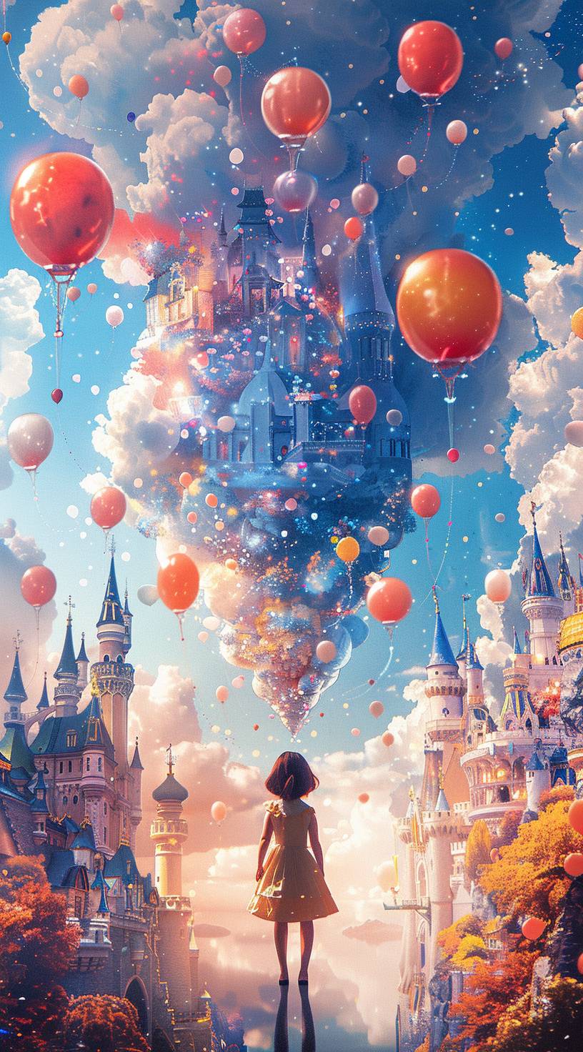 A girl in the center of an amusement park, surrounded by colorful balloons and soft pastel colors. The background features castles floating among many balloon flowers in the style of Disney. A child is standing on their tiptoes with their back to us, looking at all this beautiful scenery. This scene gives people a feeling that they can make their dreams come true. Highly detailed illustration. --ar 71:128 --stylize 750 --v 6.0
