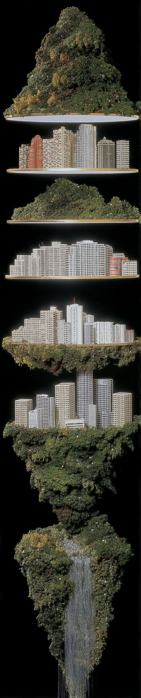 Model cities designed by Bodys Isek Kingelez, lush greenery, happy chaos