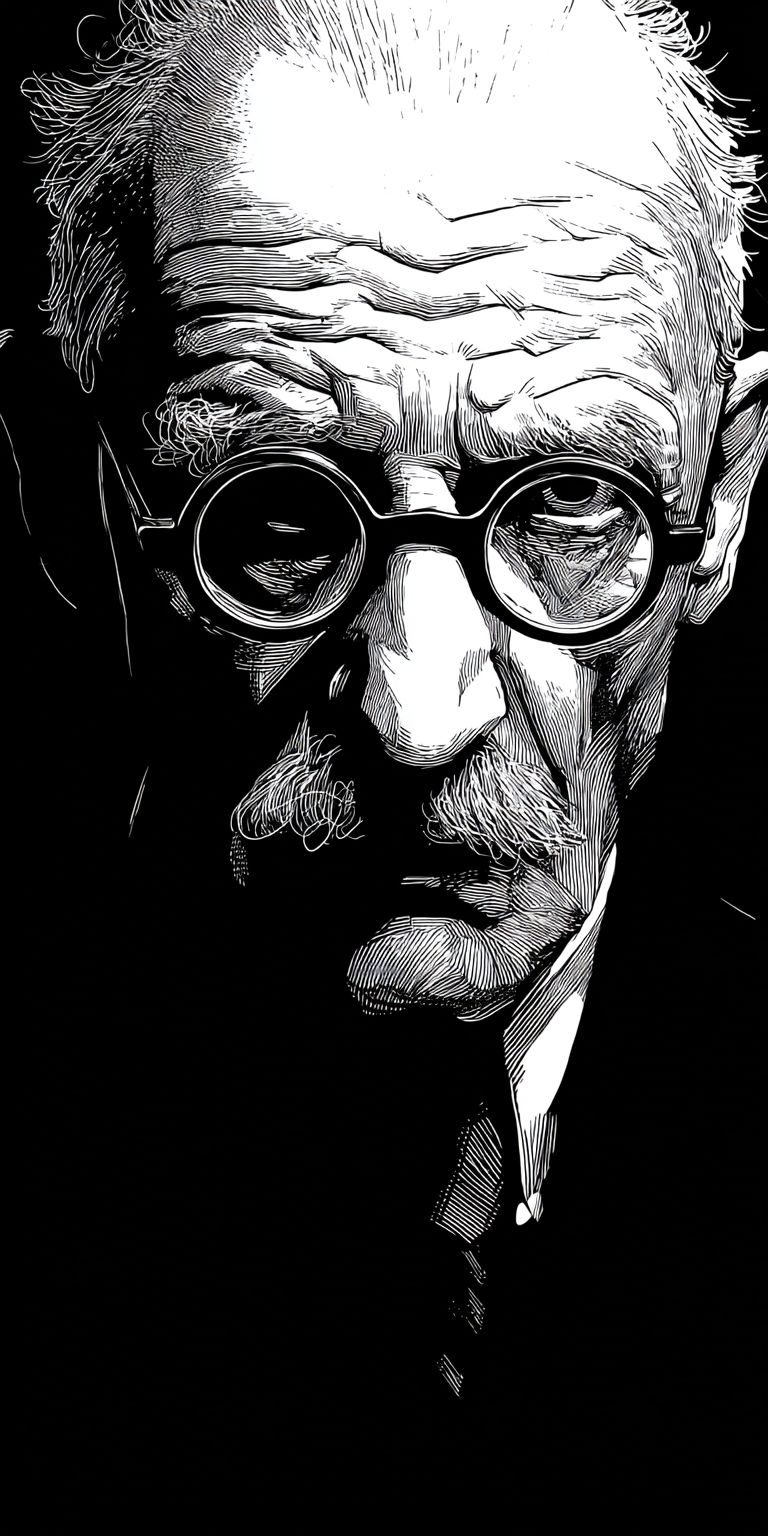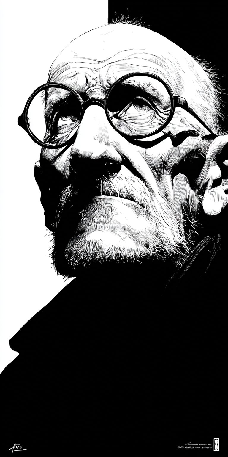 in the style of Frank Miller, Philosopher Carl Jung Disputations old old man, Glasses, stoic face, frank miller style --ar 1:2 --v 7.0