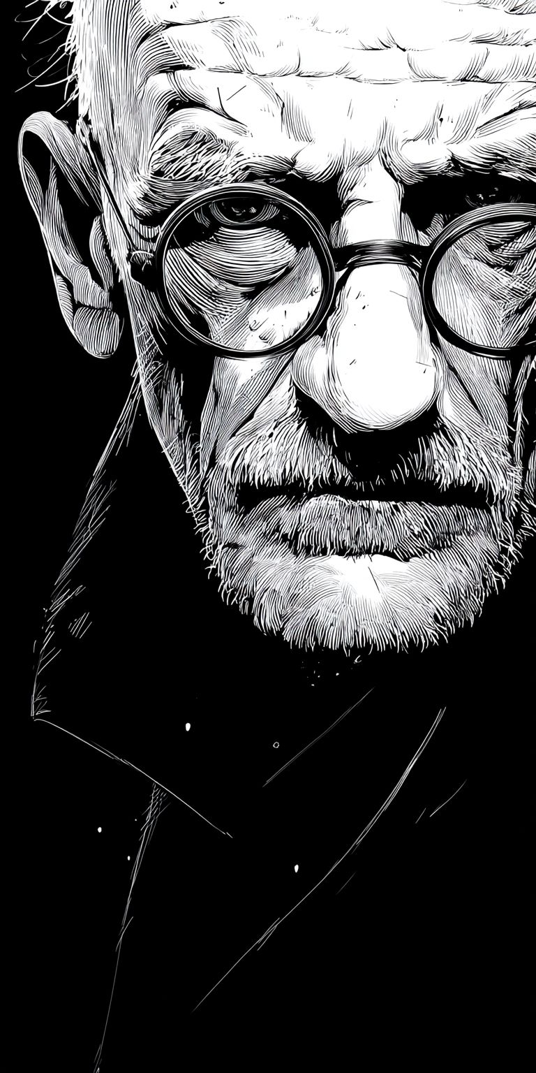 Philosopher Carl Jung disputations, old man, glasses, stoic face, Frank Miller style