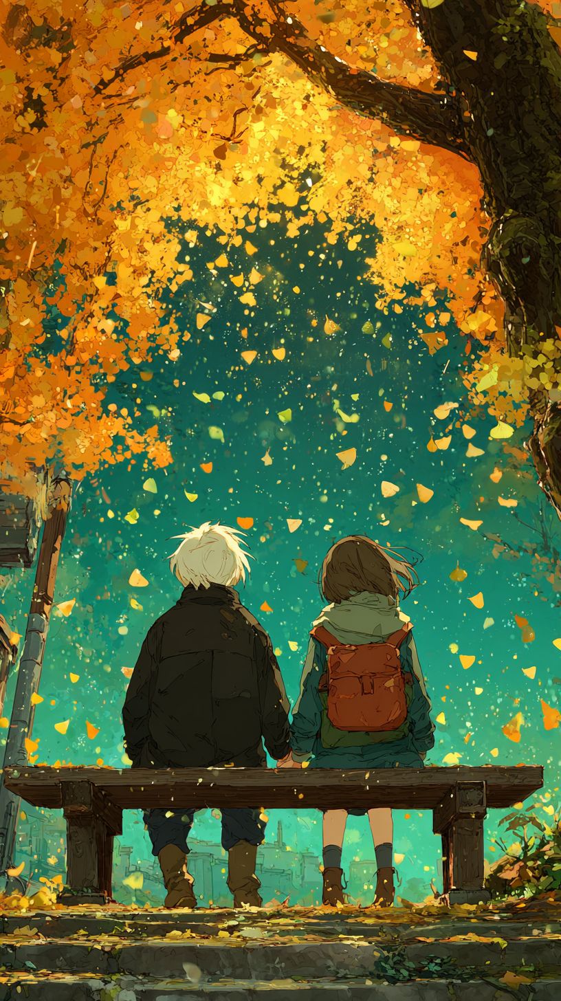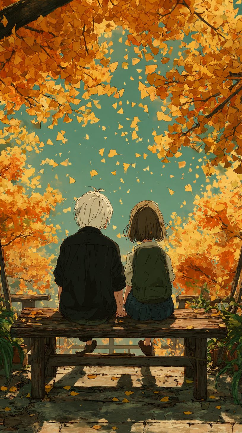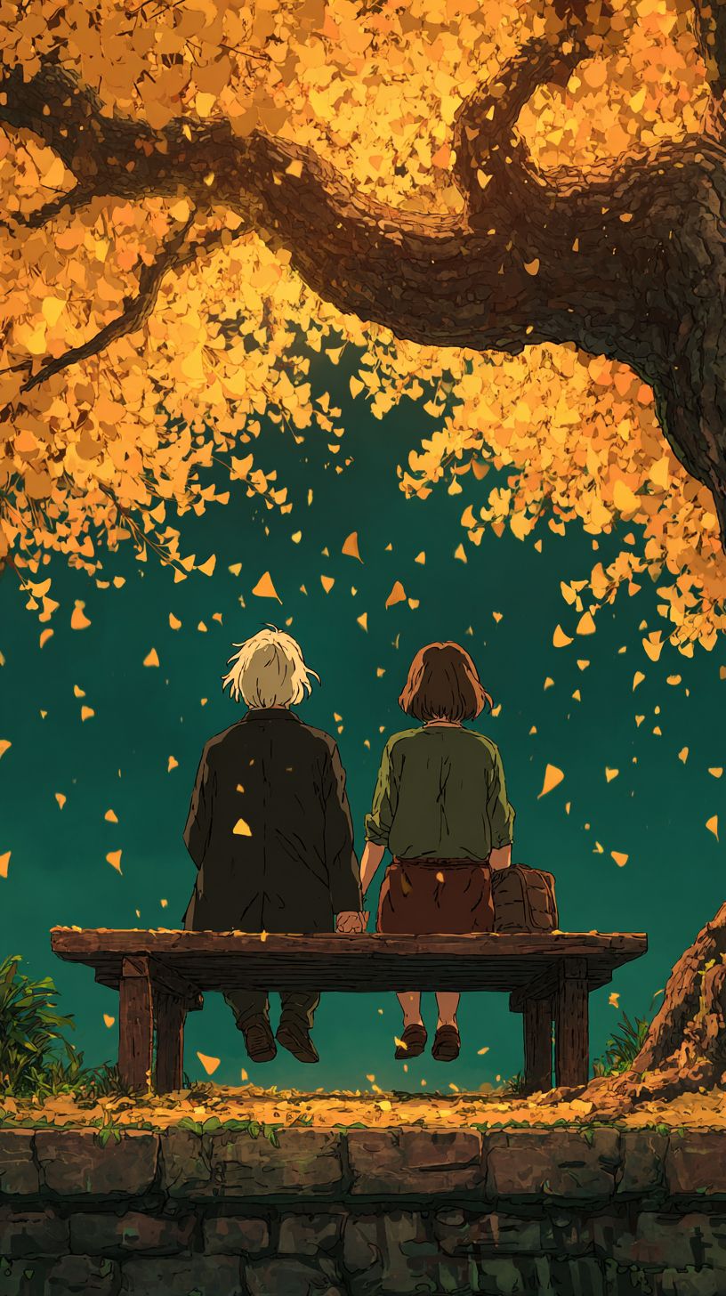 An elderly anime couple with snow-white hair under a giant ginkgo tree, fallen golden leaves floating in slow motion, Studio Ghibli-style soft glow lighting, detailed hand-holding close-up showing age spots but gentle touch, traditional wooden bench in a Japanese garden, warm orange and amber color palette, background bokeh with lens flare, Makoto Shinkai's detailed foliage rendering, emotional slice-of-life moment, slight motion blur on falling leaves --ar 9:16 --v 7.0 --s 750