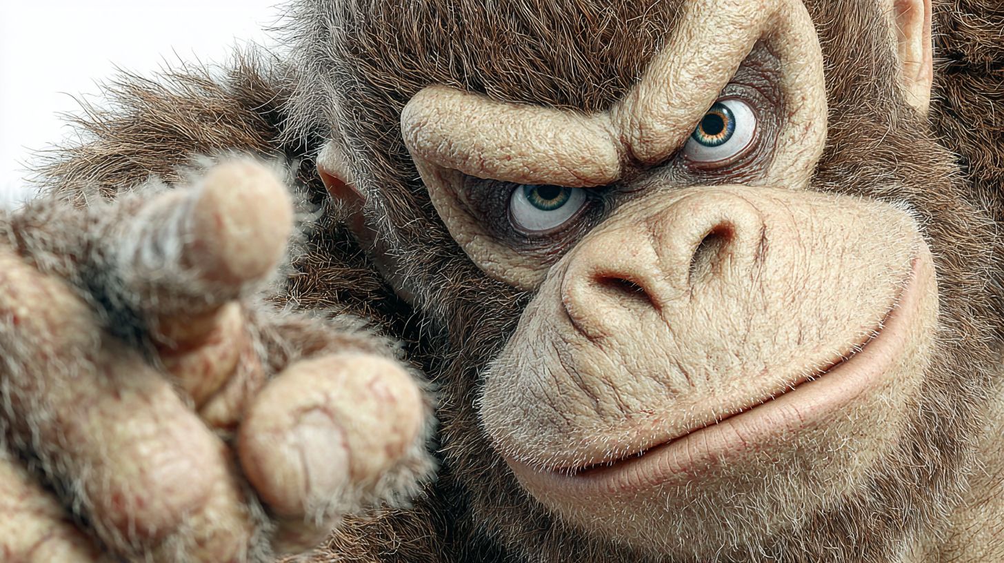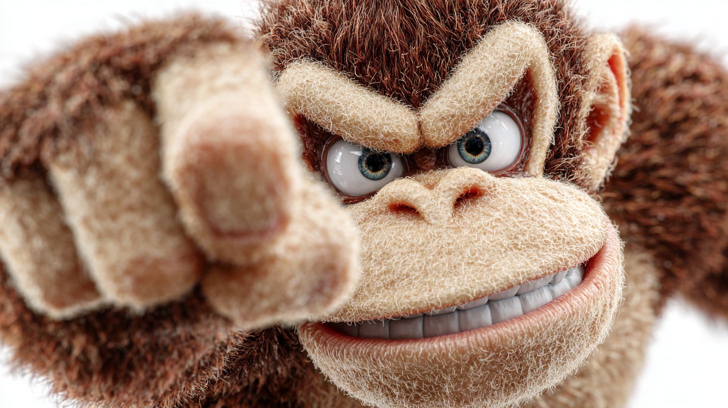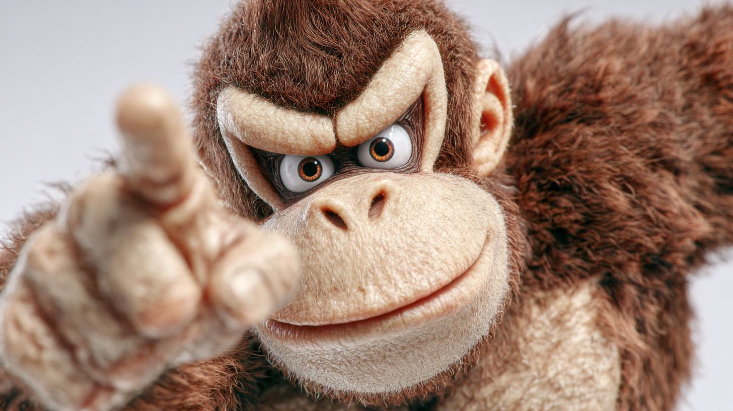 Donkey Kong looking at the camera, furious face and making a negative gesture with his hand, plain white background.