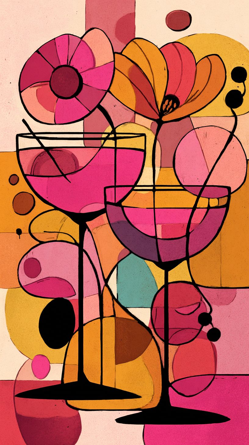 2D Pop art illustration, vibrant cocktail drink, vintage 60's style, no text, bright and feminine colors, luxurious feel, bold outlines, retro aesthetic, abundant negative space, drink occupies less than 1/3 of the area, off-center composition