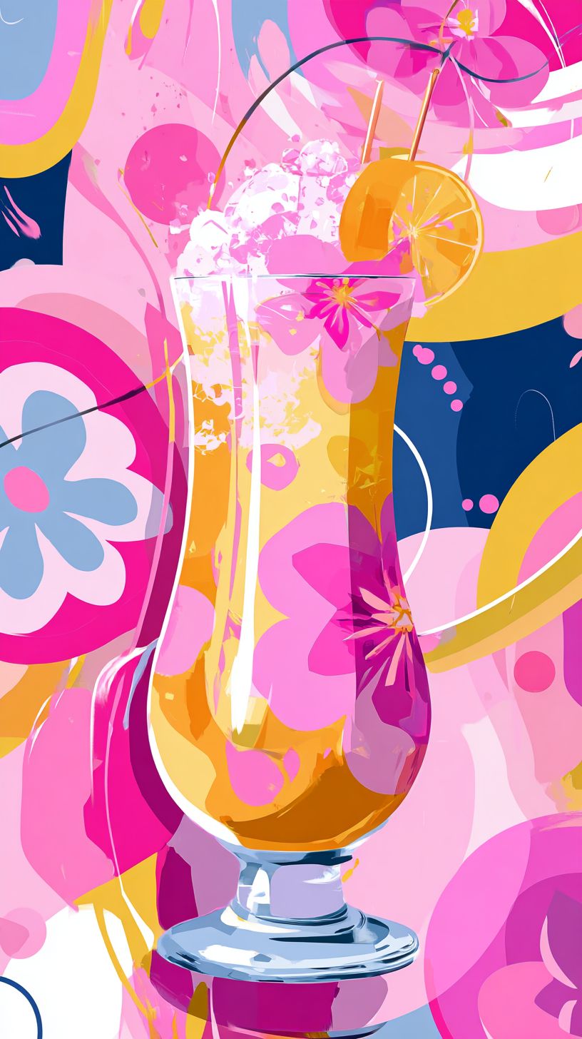2D Pop art illustration, vibrant cocktail drink, vintage 60's style, no text, bright and feminine colors, luxurious feel, bold outlines, retro aesthetic, abundant negative space, drink occupies less than 1/3 of the area, off-center composition --chaos 25 --ar 9:16 --v 7.0