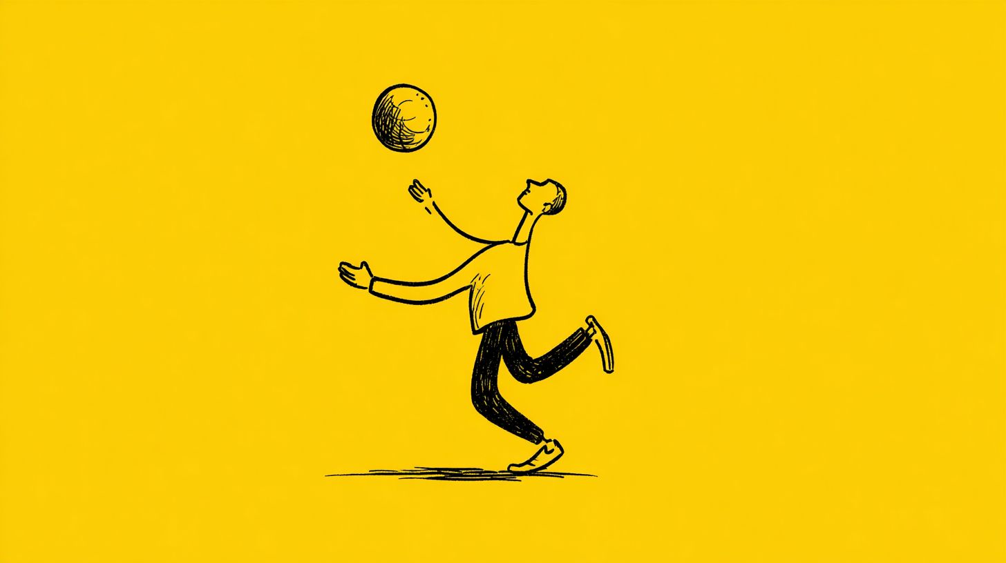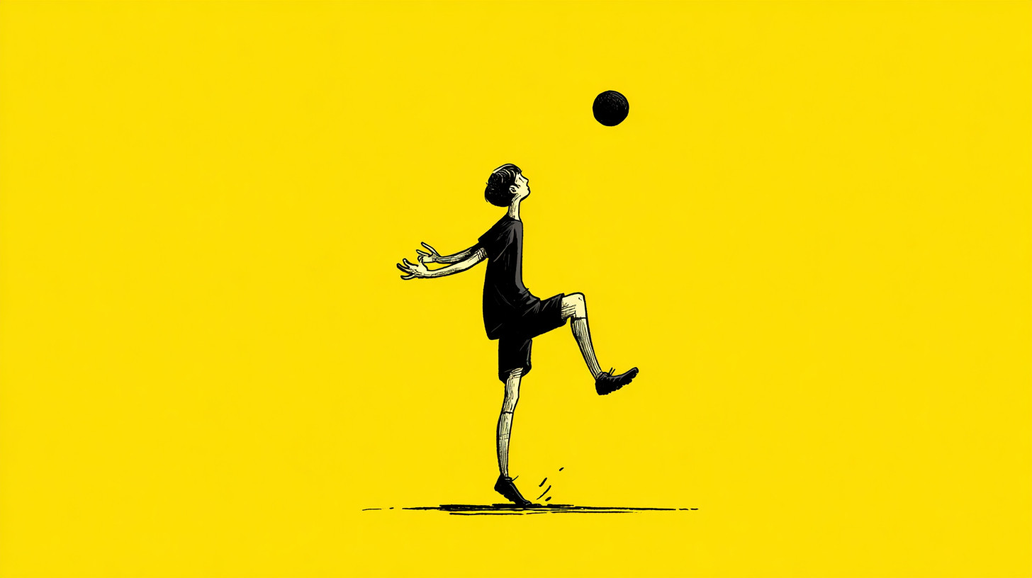 cartoon style simplistic minimalist line art of a young footballer juggling a ball, black outline only, no color, flat stroke illustration style. Clean silhouette, expressive motion, and curved limbs, isolated on solid yellow background. Bold line illustration. No shading, simple and modern design inspired by Okamura Yuta travel illustrations. --ar 16:9 --v 7.0