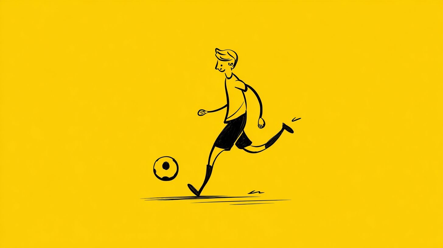 Cartoon style simplistic minimalist line art of a young footballer juggling a ball, black outline only, no color, flat stroke illustration style. Clean silhouette, expressive motion, and curved limbs, isolated on solid yellow background. Bold line illustration. No shading, simple and modern design inspired by Okamura Yuta travel illustrations.
