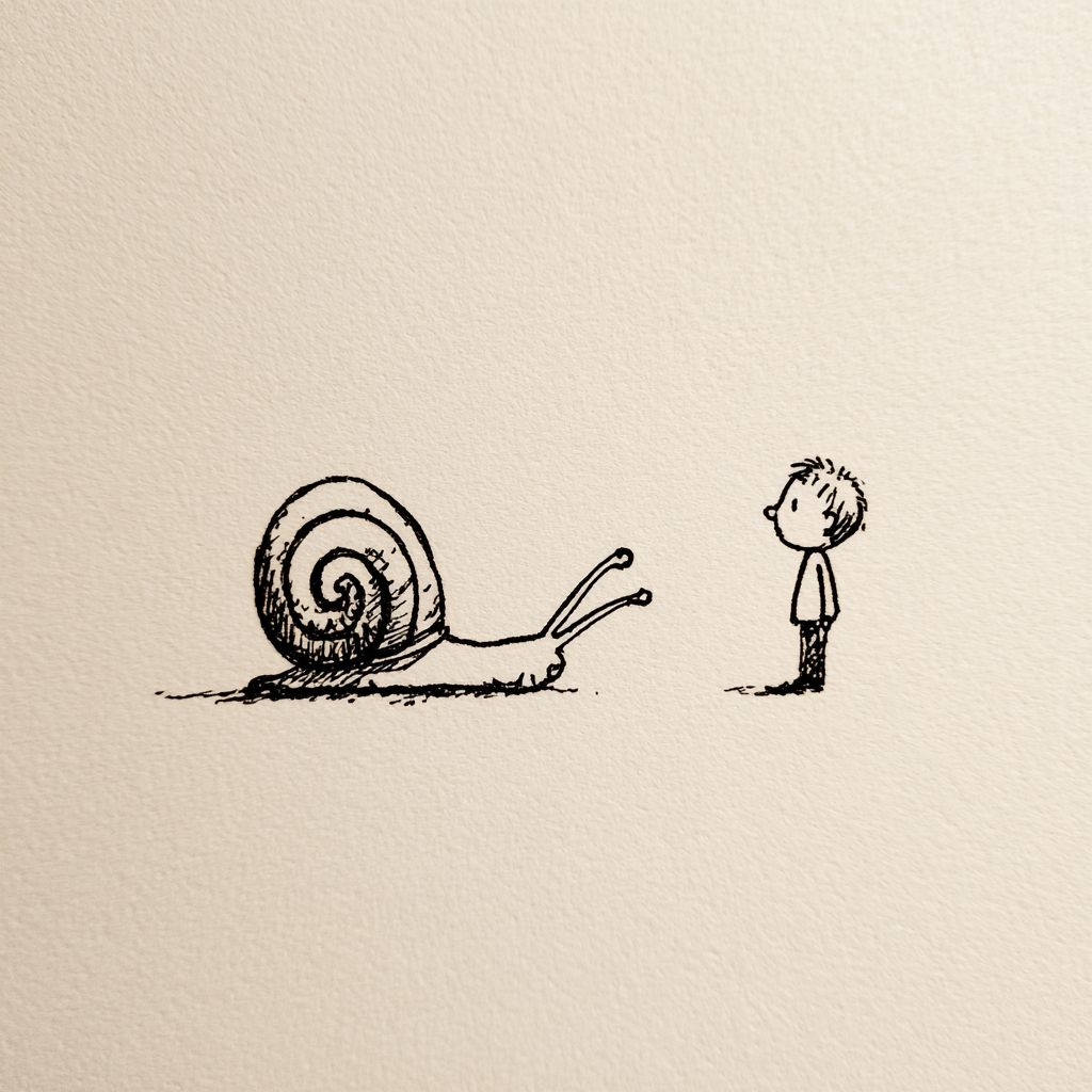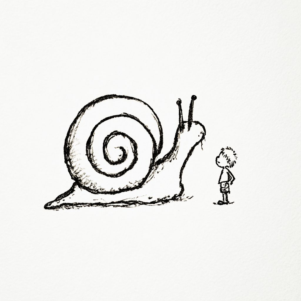 Draw a snail with a light-colored shell, and a child looks at it in amazement. Minimalist style, drawn in ink on paper, pure white background, colorless, using only black and white, childish doodle, pure white background, comic, humor.