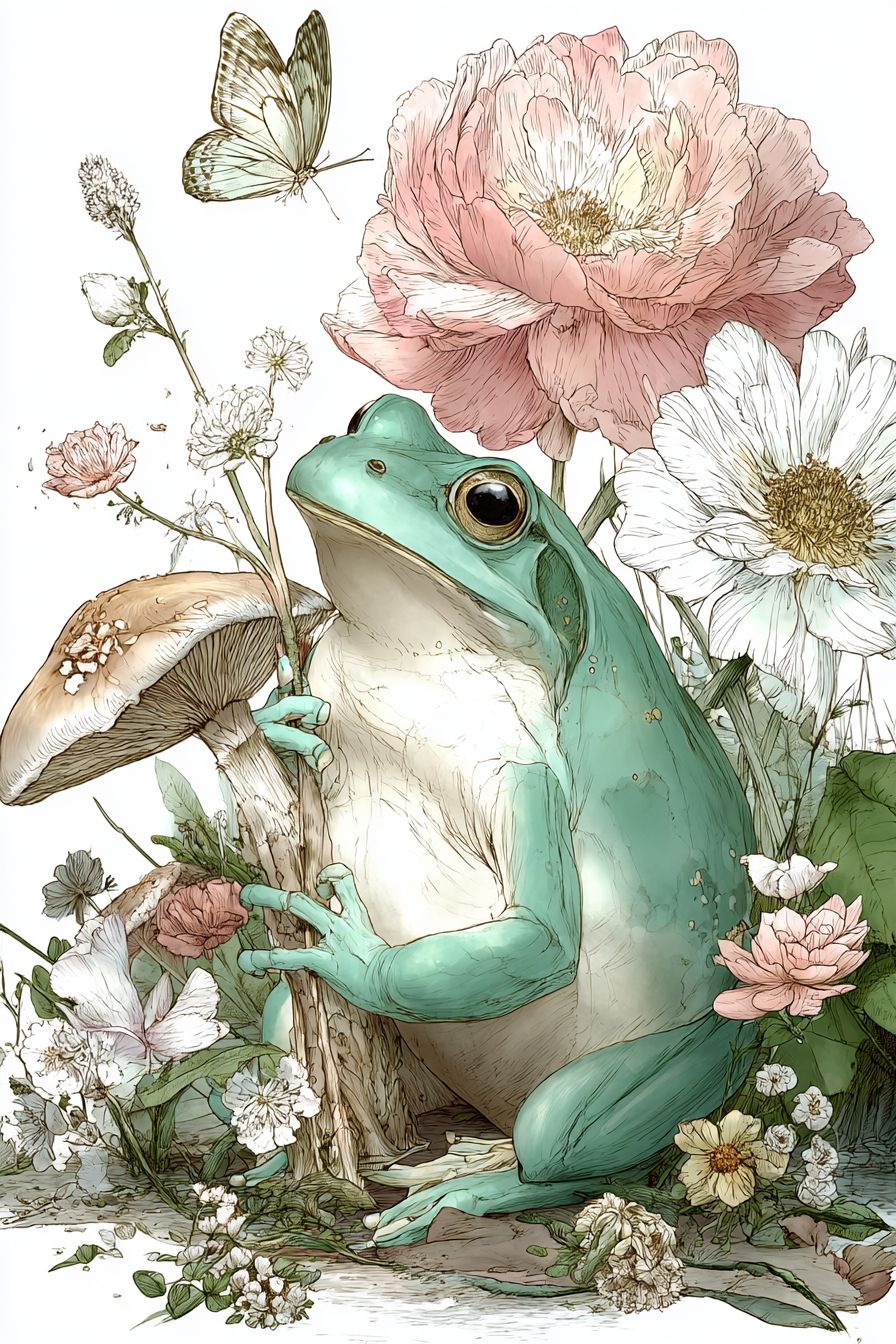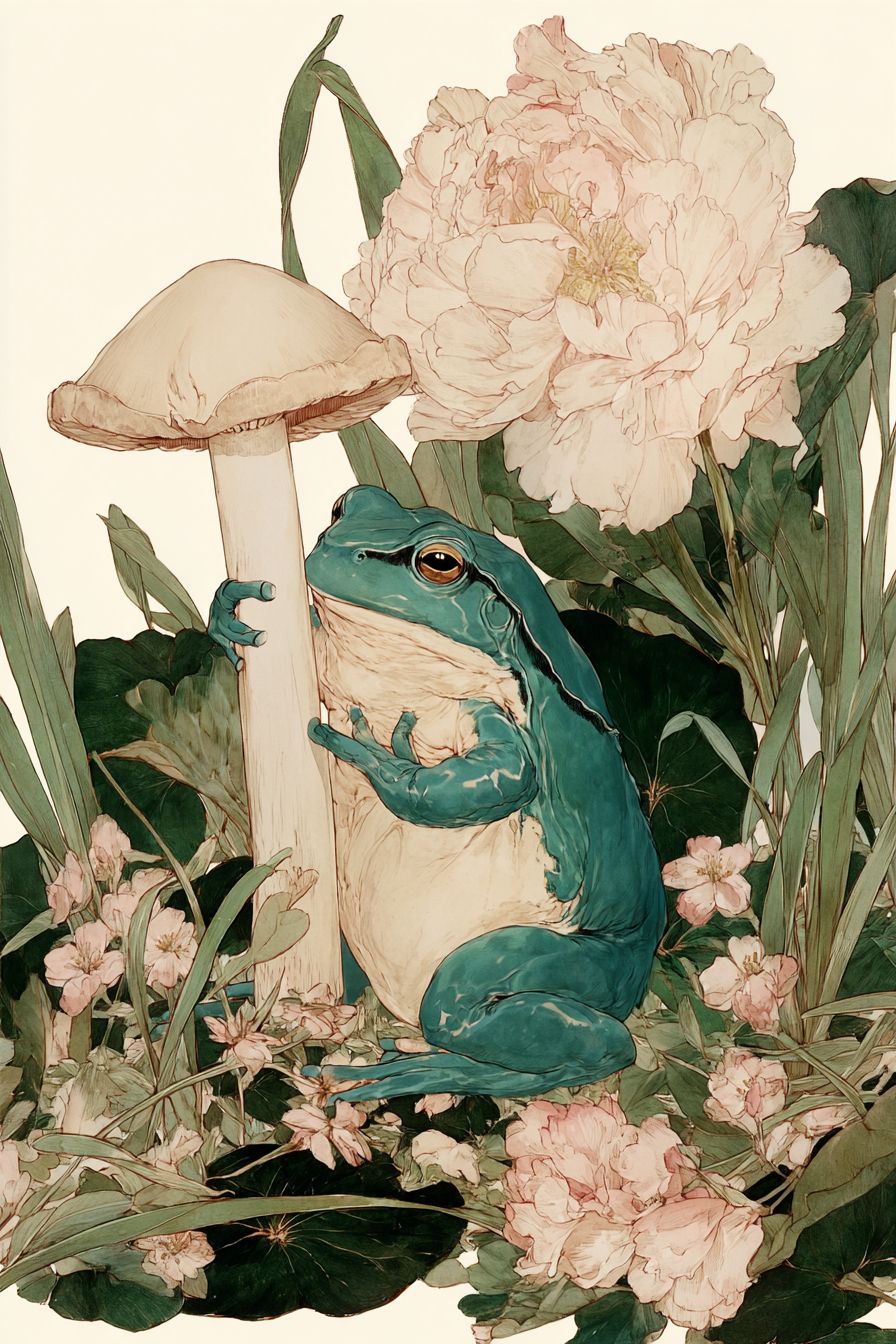Whimsical Japanese hand-painted frog sitting under a mushroom, surrounded by soft wildflowers, pastel cottagecore style, ink and watercolor look, serene and calming.