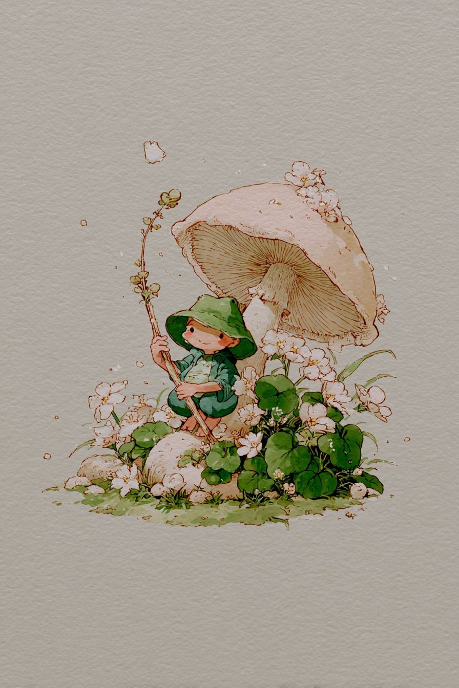 A hand-painted Japanese frog sitting under a mushroom with soft wildflowers