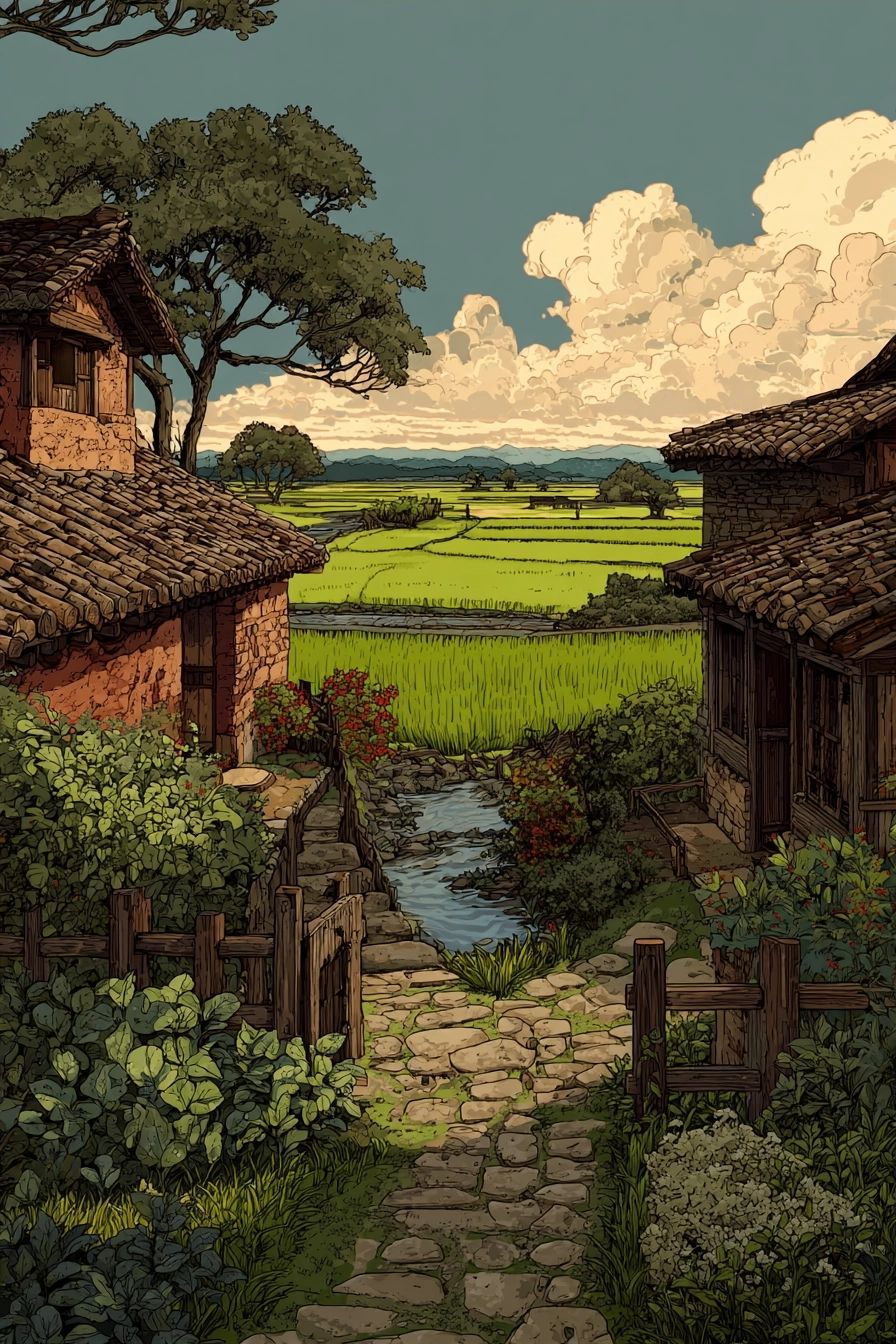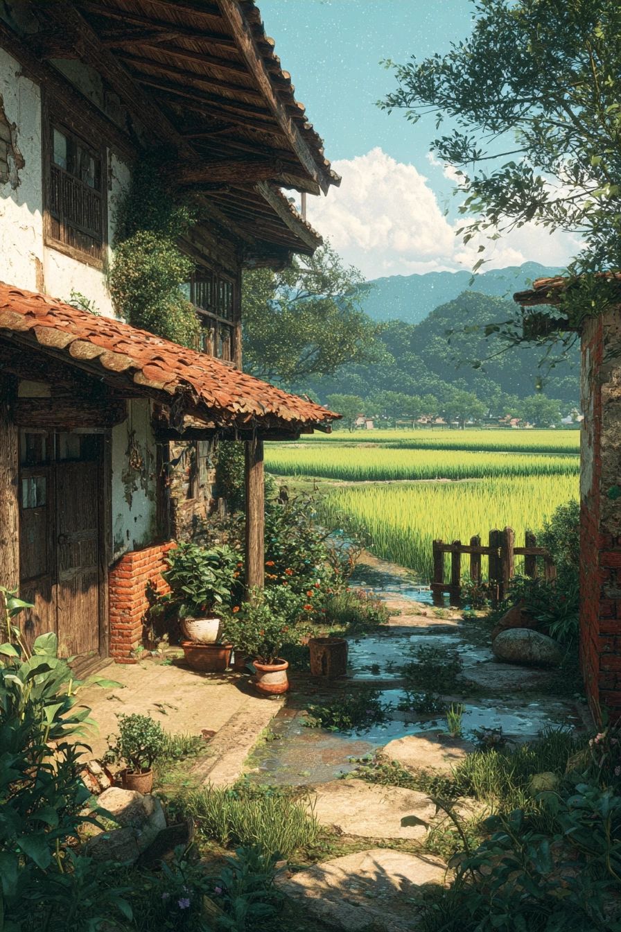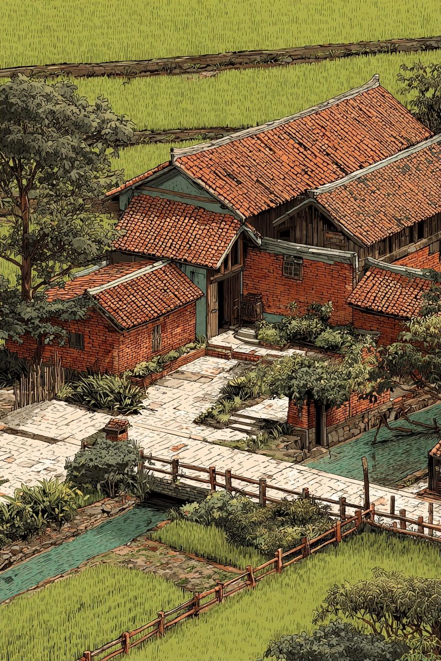 A real scene with a vintage style, featuring a farmhouse courtyard, rammed earth houses, a fence, a small stream, and lush green rice fields outside the yard. The image is detailed, the atmosphere is warm, and it is in a realistic illustration style with a wide-angle lens. --v 7.0 --ar 2:3