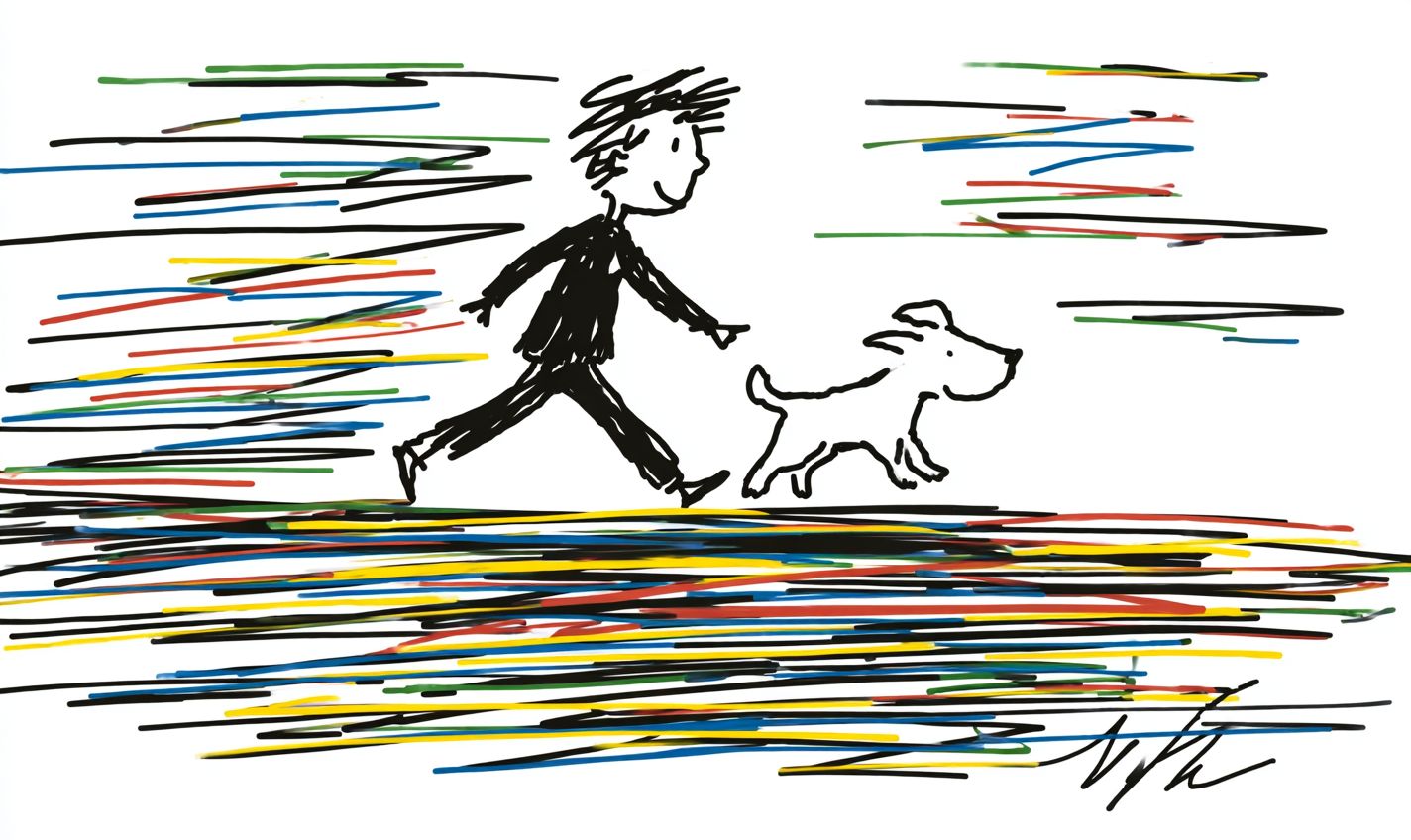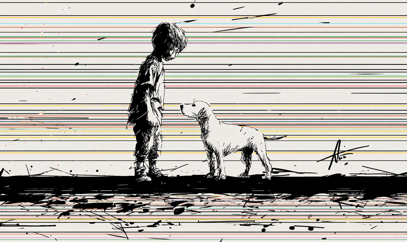 Boy and dog, signature strokes, black lines, white background, intermittent black lines, simple line drawing, vector illustration, graphic design, white background, colored lines, graffiti style, simple coloring. --v 7.0 --ar 5:3