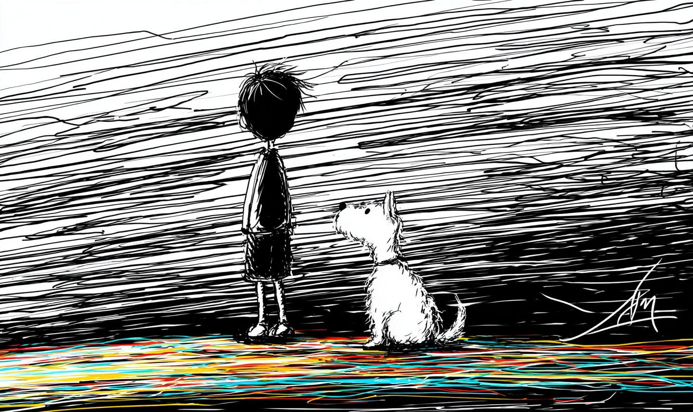 Boy and dog, signature strokes, black lines, white background, intermittent black lines, simple line drawing, vector illustration, graphic design, white background, colored lines, graffiti style, simple coloring.