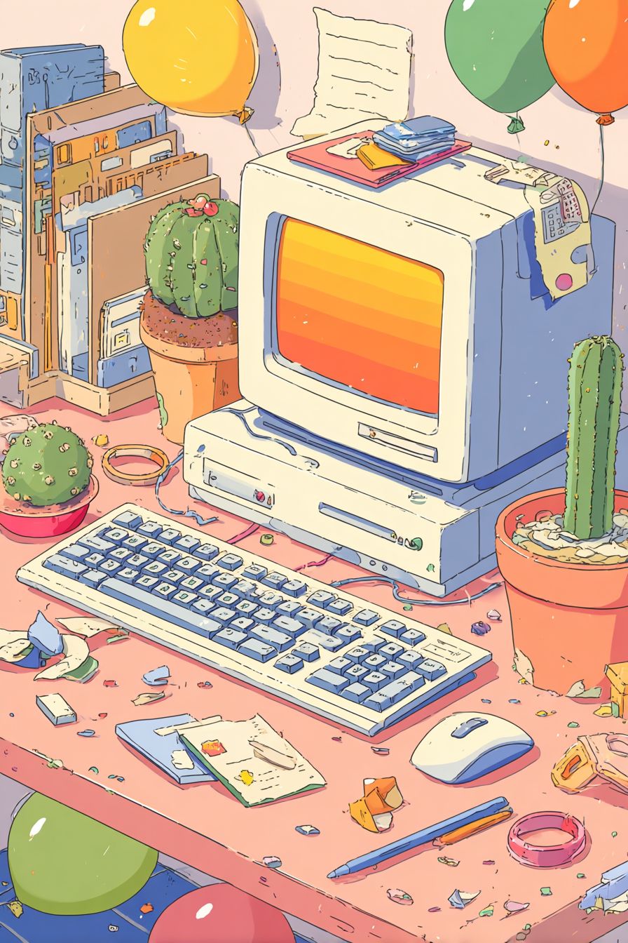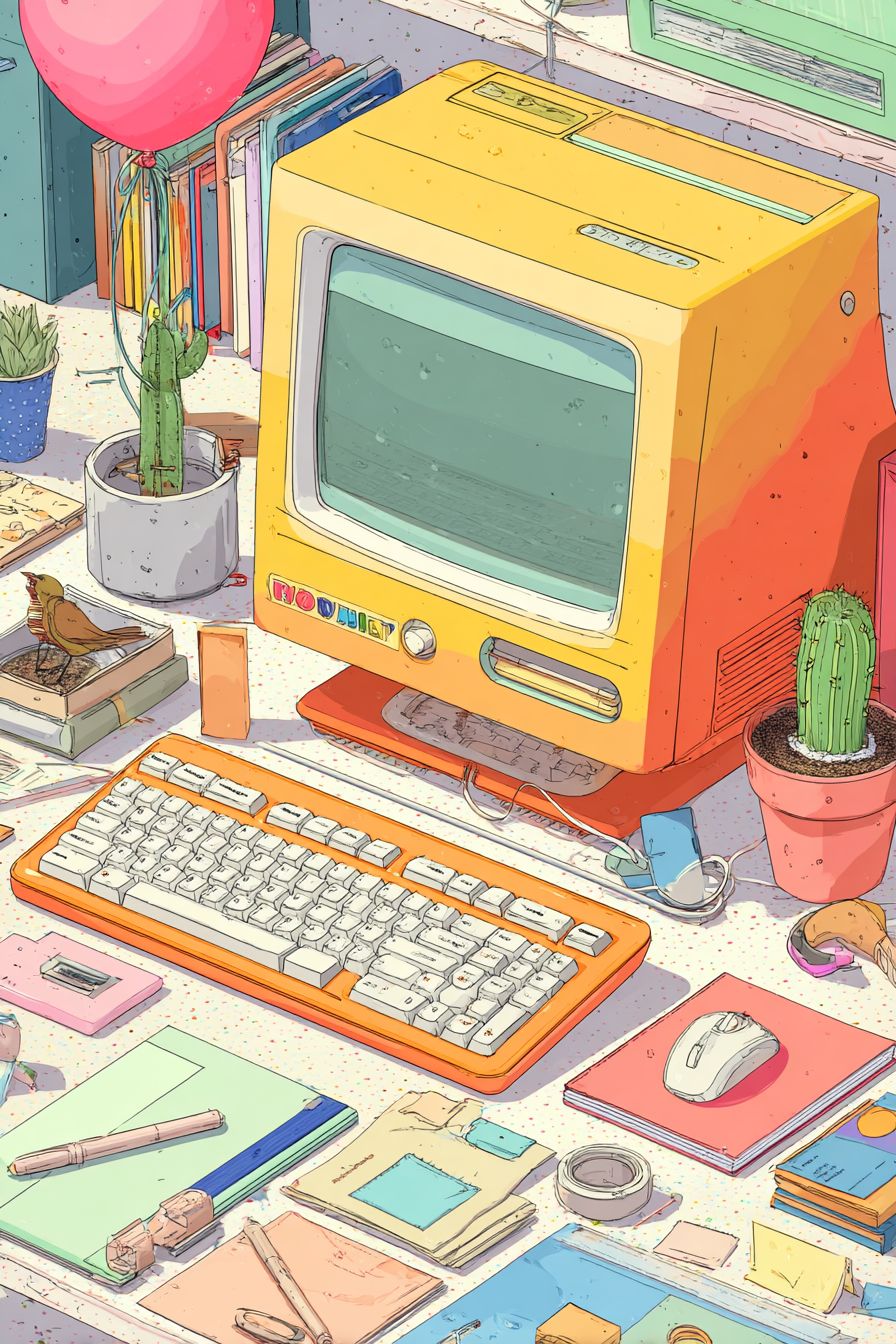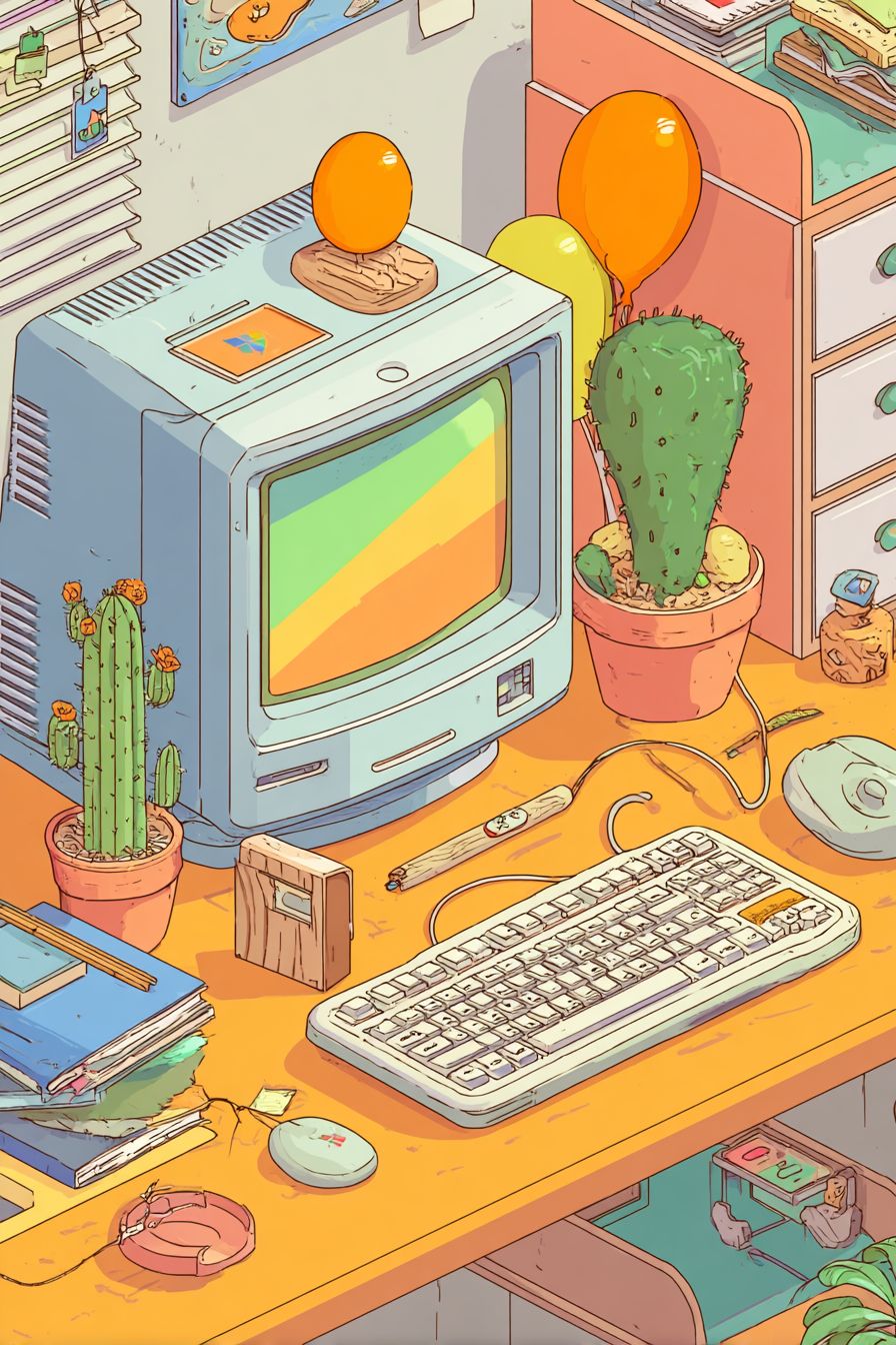 Scene Design: A cartoonish retro computer desktop scene featuring a Windows 95 style computer with a vibrant orange-yellow gradient. Item Elements: Include cute cartoon objects such as a wooden bird, a cactus potted plant, and a vintage keyboard and mouse. Color Usage: Utilize bright colors (like orange, green, blue, and yellow) with a soft light-colored background to highlight the vibrant items. Cartoon Style: All elements should have a cartoonish design with simple lines and exaggerated shapes, creating a relaxed and fun atmosphere. Desktop Details: Include a keyboard, mouse, files, tape, balloons, pens, folders, etc., to enhance the cluttered yet interesting feel of the desktop. Light and Shadow Effects: Soft lighting to ensure each element is clearly visible, with a gentle background color that emphasizes the cartoon elements in the foreground. --v 7.0 --ar 2:3