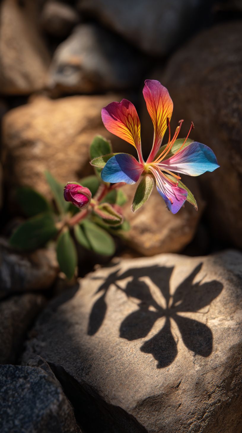 A vibrant, rainbow-colored flower with petals in shades of pink, orange, blue, and white, casting a shadow on a light background. The flower has a green stem with a small pink bud and green leaves, set against a backdrop of natural, rough stones. The scene is softly lit, highlighting the delicate beauty of the flower.