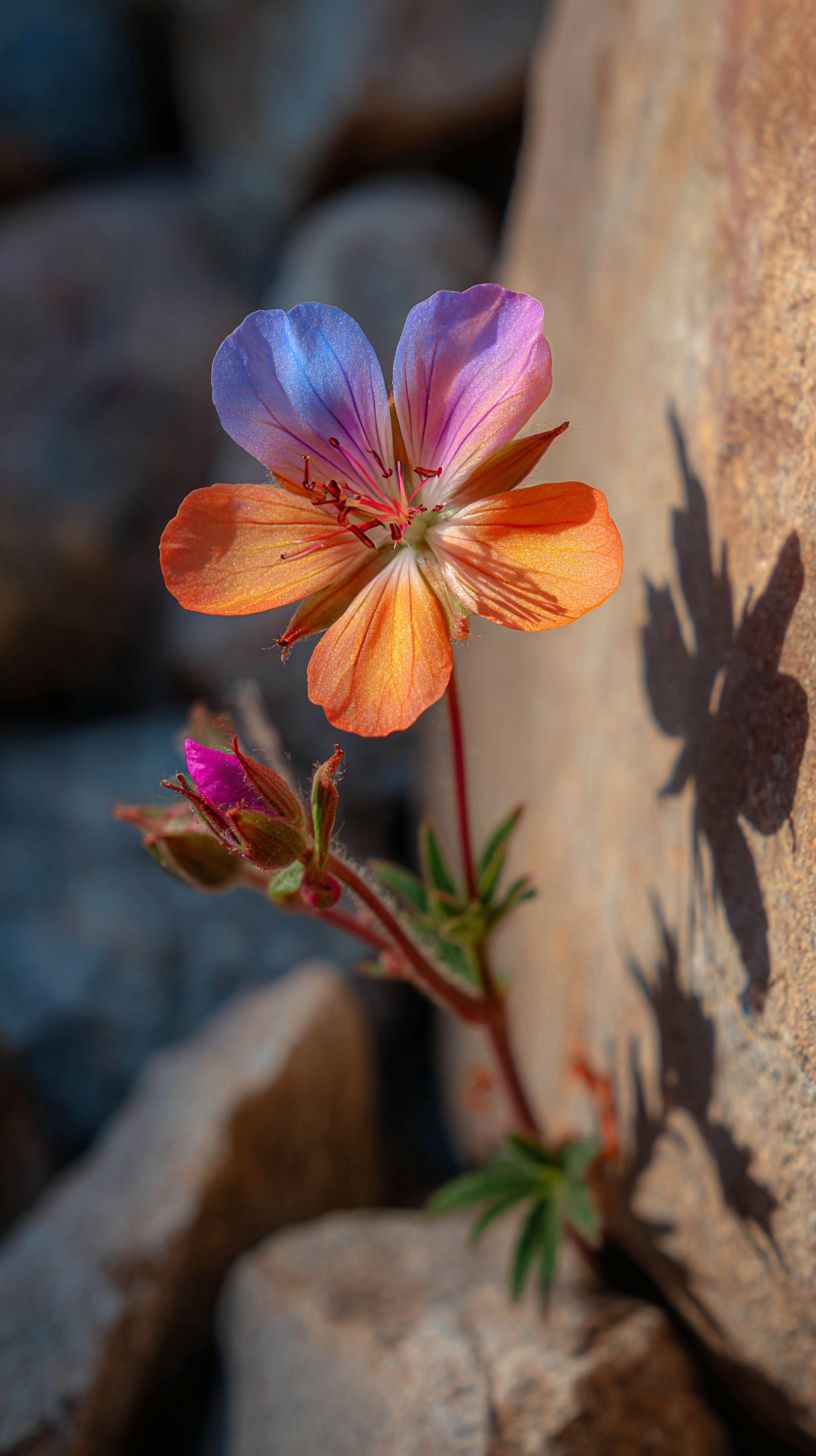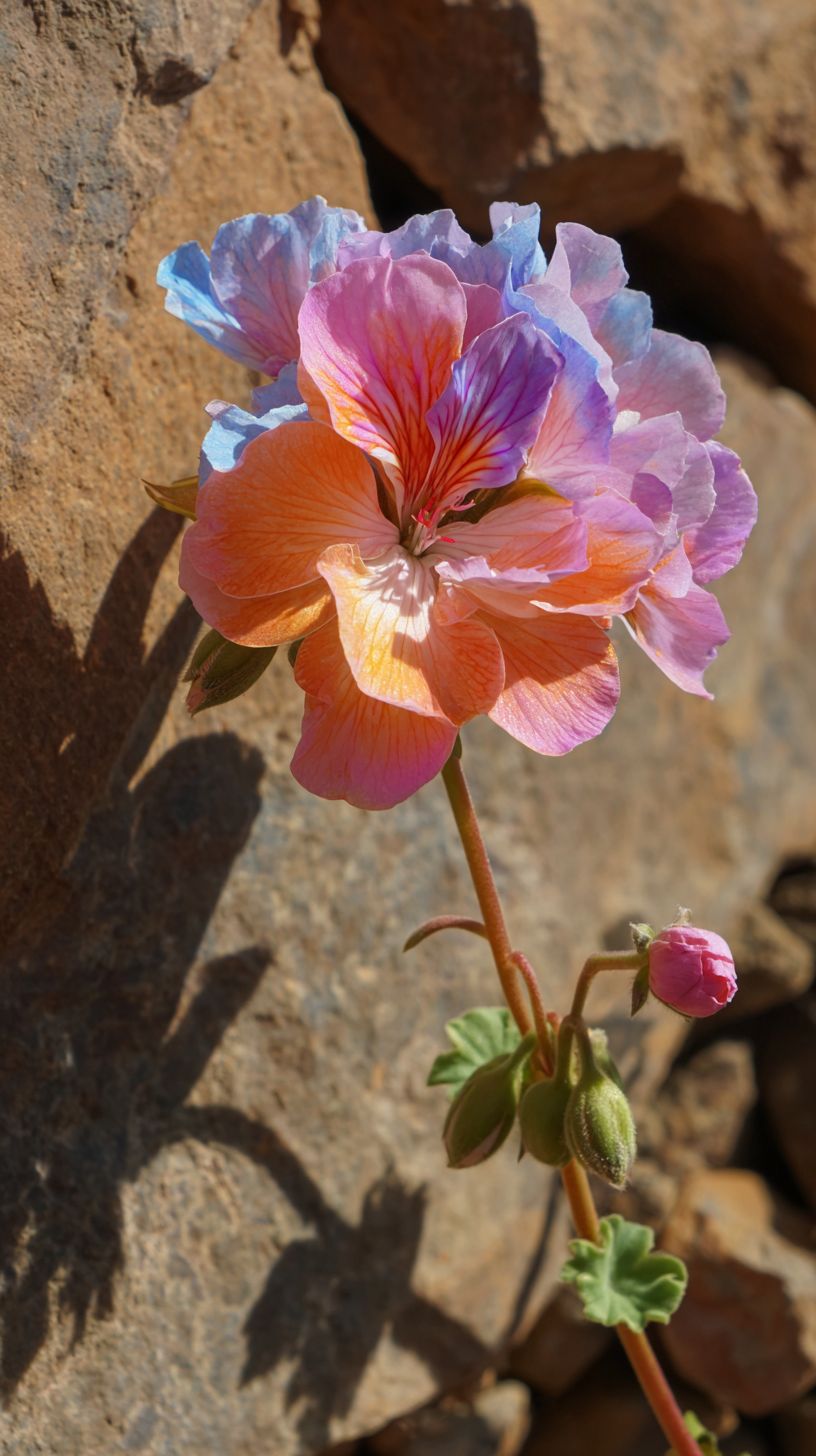A vibrant, rainbow-colored flower with petals in shades of pink, orange, blue, and white, casting a shadow on a light background. The flower has a green stem with a small pink bud and green leaves, set against a backdrop of natural, rough stones. The scene is softly lit, highlighting the delicate beauty of the flower. --v 7.0 --ar 9:16