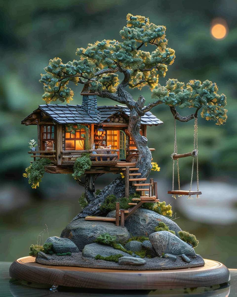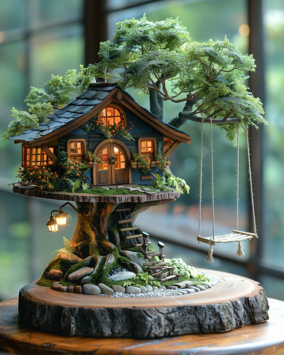 Miniature treehouse diorama on a wooden base, featuring a tiny rope ladder, swing, and lush tree canopy. Dappled sunlight filters through the leaves, creating playful shadows.
