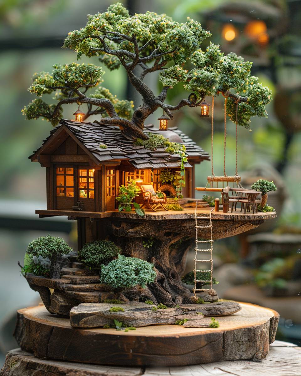 Miniature treehouse diorama on a wooden base, featuring a tiny rope ladder, swing, and lush tree canopy. Dappled sunlight filters through the leaves, creating playful shadows --ar 4:5 --stylize 1000 --v 6.0