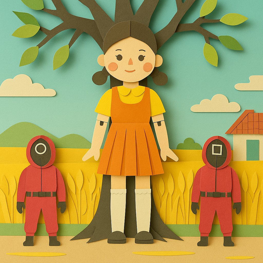 Transform the image into a children's book illustration in digital paper craft style with colorful paper layers for characters and background