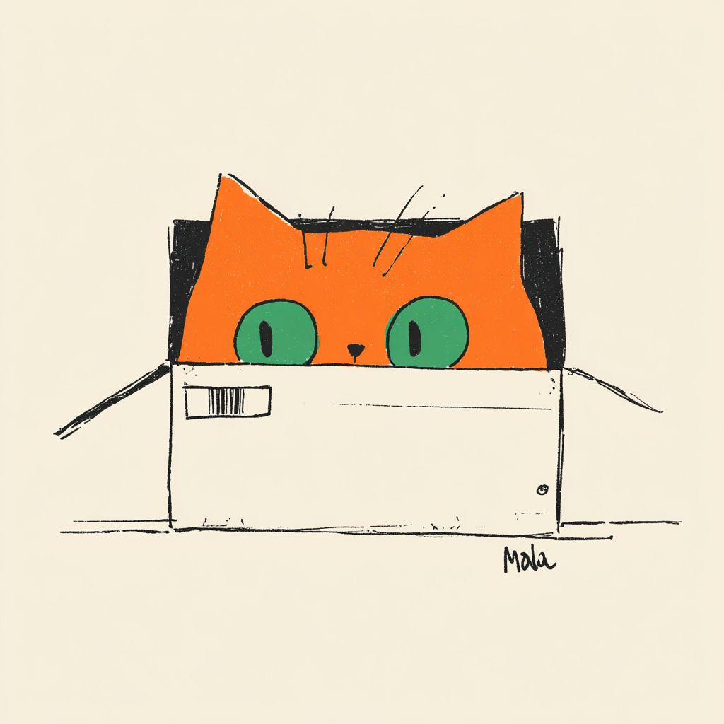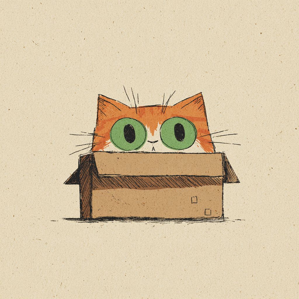 A drawing of a cardboard box with a cute cat in it. The cat is orange and has big green eyes, in a colorful cartoon tattoo style --ar 1:1 --profile fxf91qa --stylize 50 --v 7.0 --raw