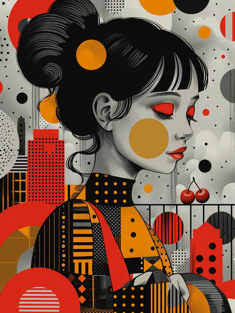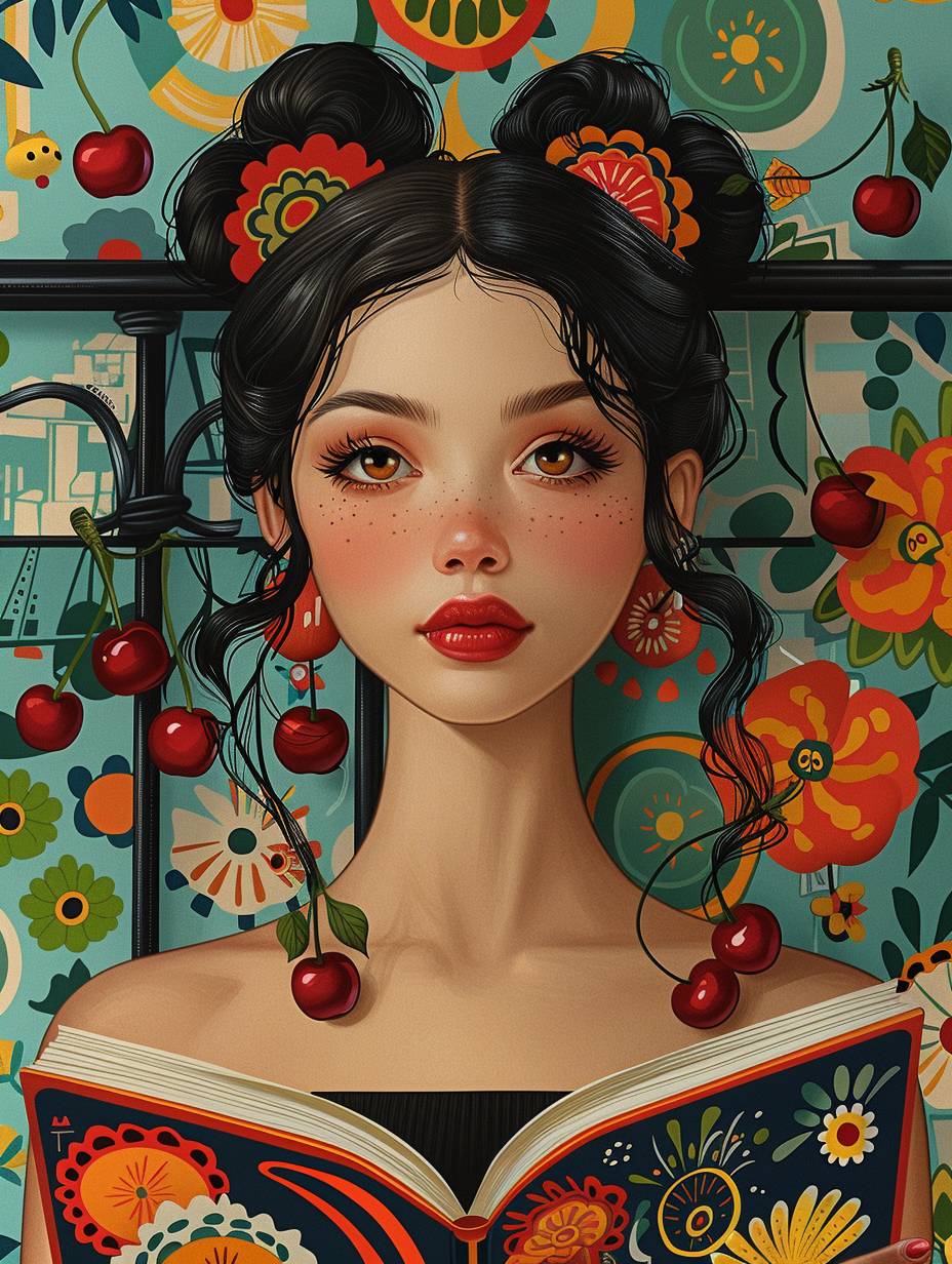 A pretty girl is reading a book and eating cherries on the balcony, by element of happiness, doodle in the style of Keith Haring, sharpie illustration, bold lines, in the style of grunge beauty, mixed patterns, text and emoji installations --ar 3:4 --stylize 750 --v 6.0