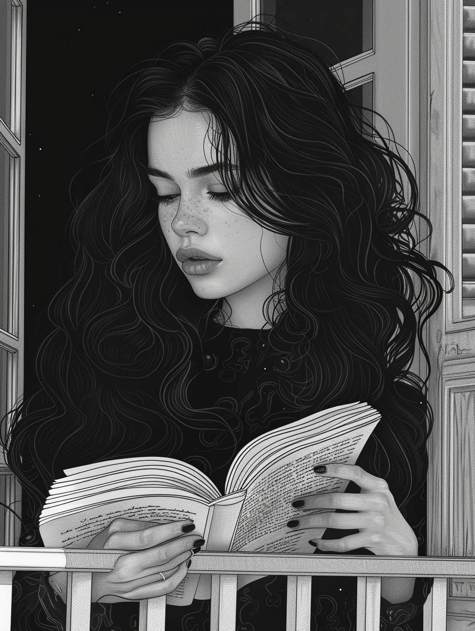A pretty girl is reading a book and eating cherries on the balcony, expressing elements of happiness in a doodle style.