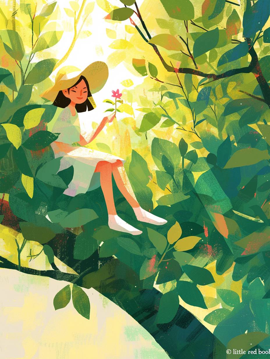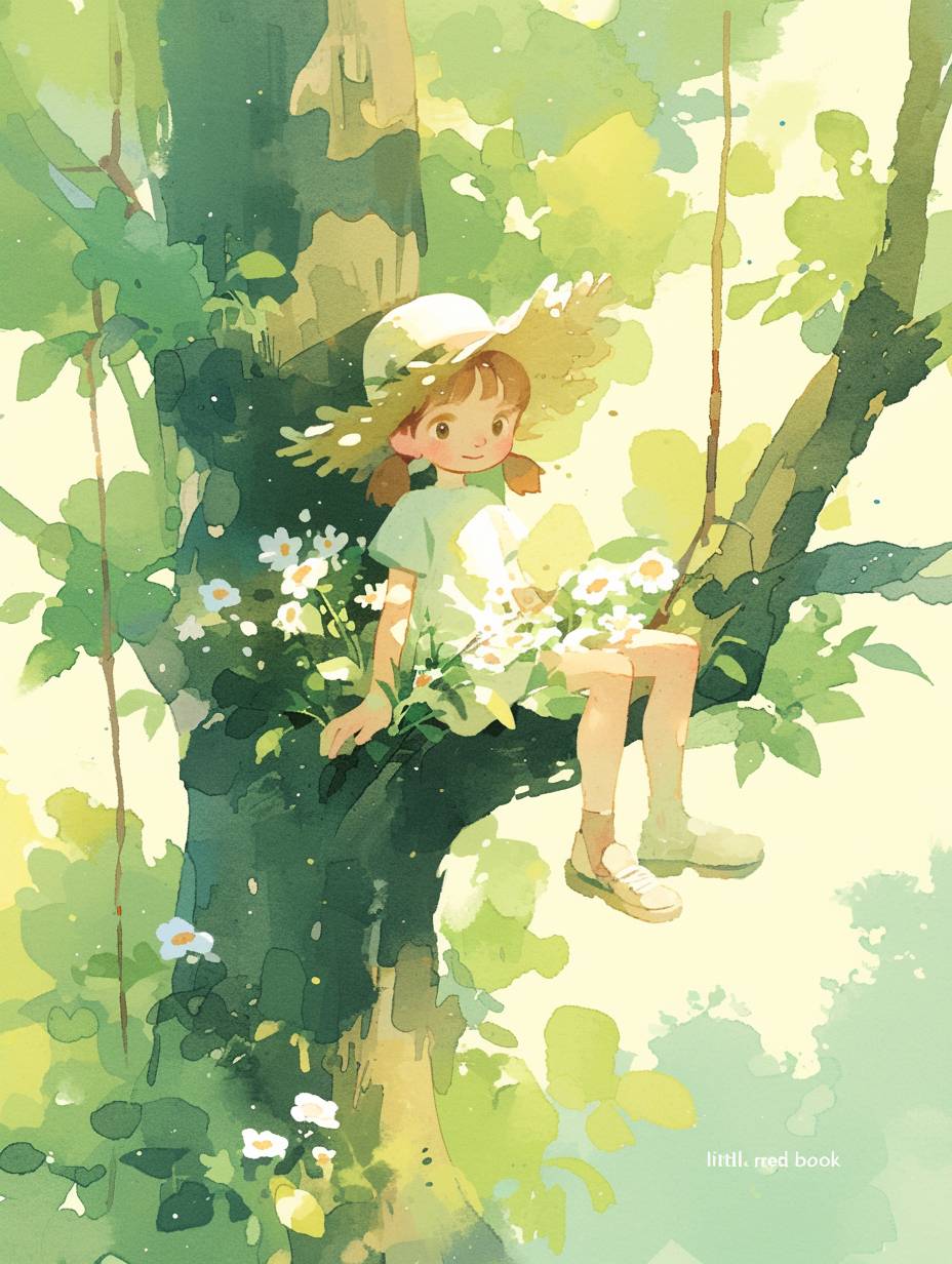 A girl is sitting on a tree, wearing white shoes and a green sun hat, holding flowers in her hand. The background of trees has soft light shining through, creating a fresh color scheme. This illustration was created by an artist named 'little red book'. It features soft edges and delicate brushstrokes, flat style, simple lines, cartoon characters, watercolor painting effects, children's illustrations, colorful colors, and a dreamy atmosphere.