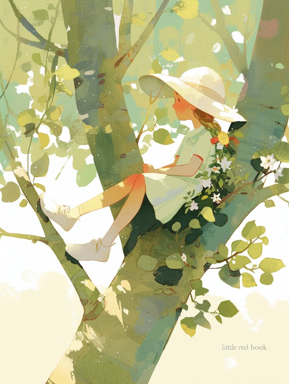 A girl sits in a tree wearing white shoes and a green sun hat, holding flowers. The background features soft light filtering through trees, creating a fresh color scheme with a dreamy atmosphere.