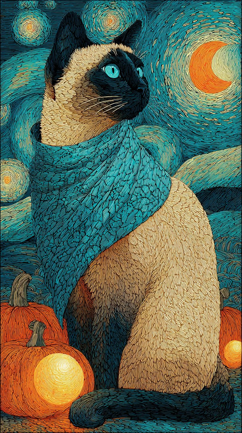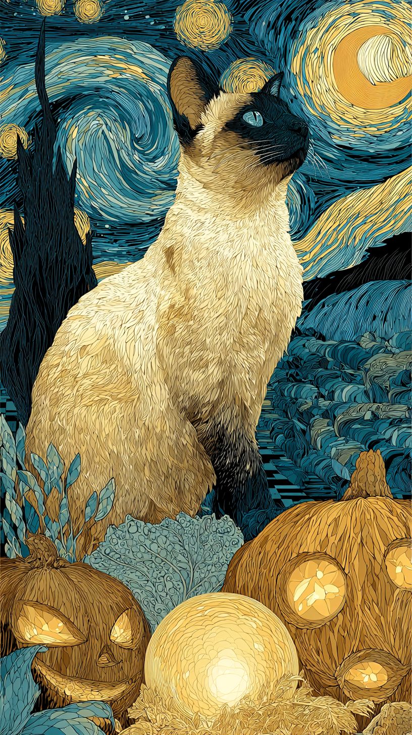 The High Priestess tarot card, a Siamese cat veiled in shadows, seated between two carved pumpkins with glowing eyes, glowing crystal ball in her paws, Van Gogh Starry Night style, --ar 9:16 --stylize 750 --v 7.0