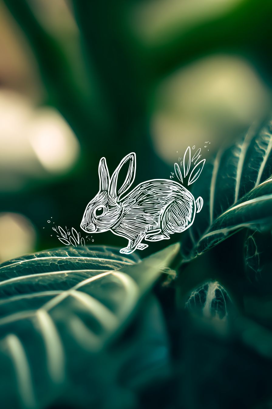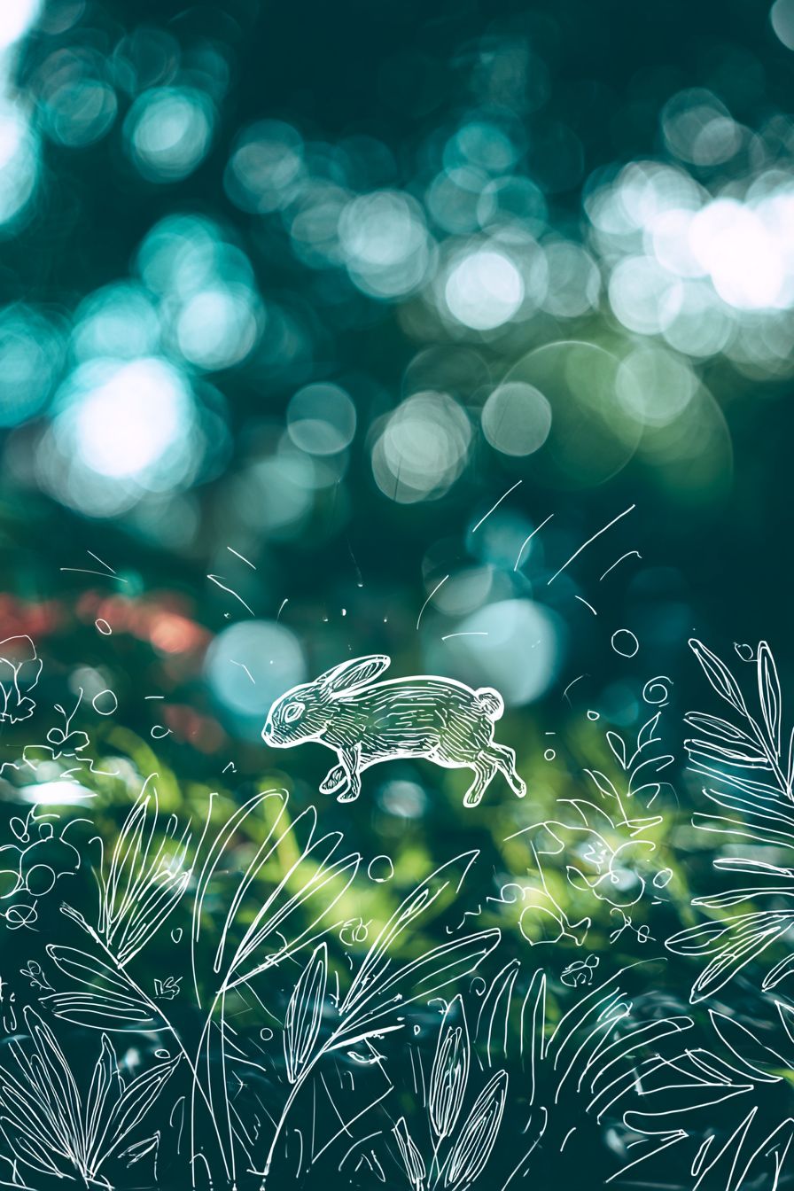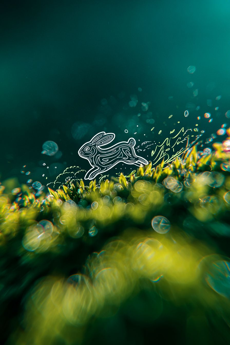 Depth of field photography, featuring a dynamic illustration in a graffiti style with clear brush strokes. In the center of the image, a white vector outline of a small rabbit is running on an outdoor lawn, surrounded by colorful line decorations. The background is a high-contrast deep green, with a black-green contrast, bokeh lens effects, and strong depth of field. --ar 2:3 --v 7.0
