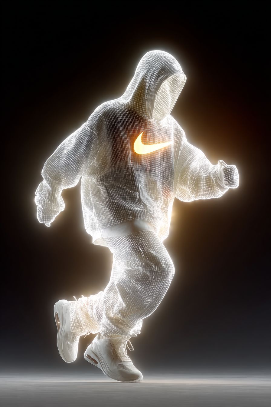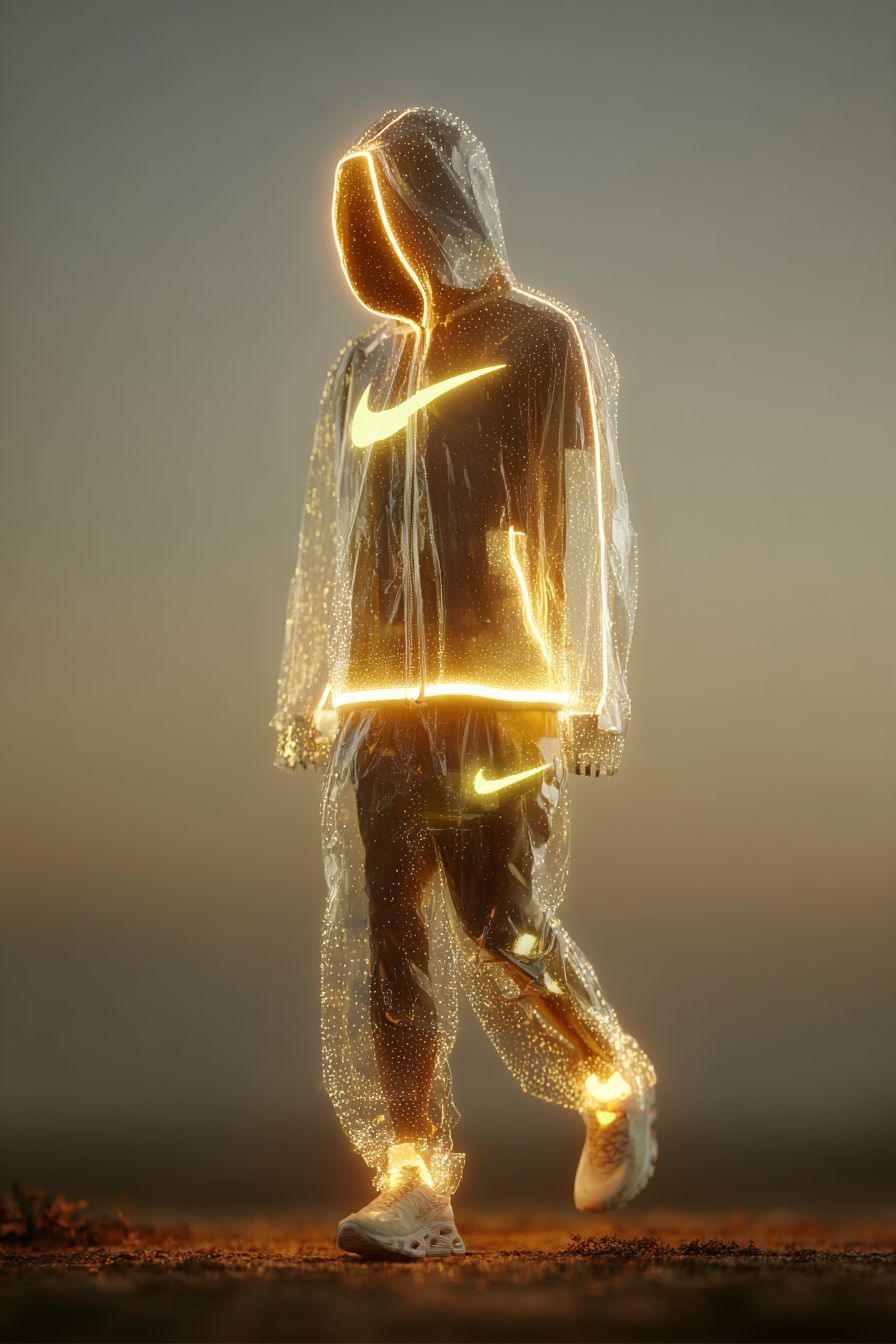 A floating Nike sportive outfit shaped as if worn by an invisible person, hollow inside, soft glow, vertical composition, cinematic mood.