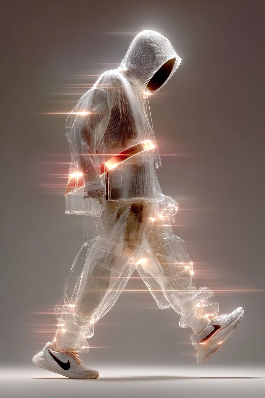 a floating Nike sportive outfit walking with no body inside, shaped as if worn by an invisible person, hollow inside, soft glow, vertical composition, cinematic mood, V7 --chaos 5 --ar 2:3 --raw --s 750