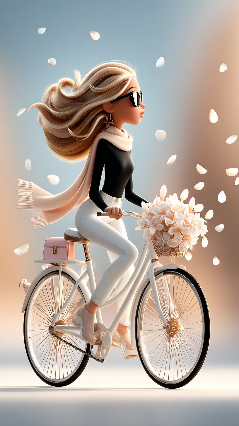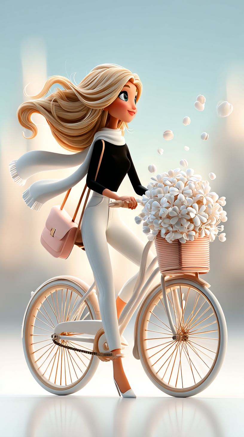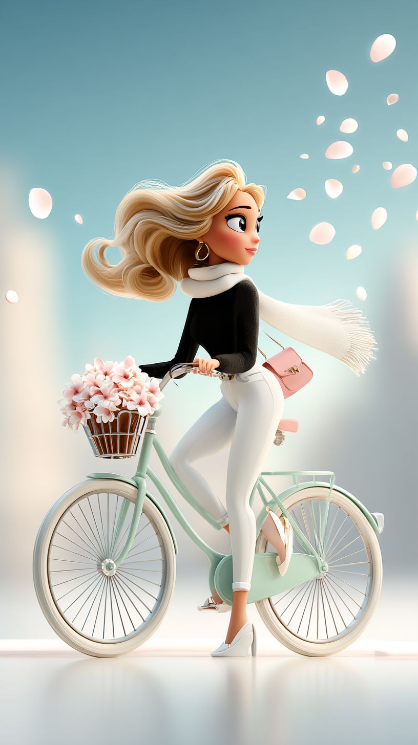 Elegant cartoon-style illustration depicting a joyful, stylish young woman riding a vintage bicycle on a sunny day. The girl steering wears a black top, white blouse, cropped jeans, a fluttering scarf, and a small pink backpack. She has light blonde hair blowing in the wind. A bouquet of flowers is tied to the rear rack of the bicycle, with petals floating in the air. White minimalist background, soft lighting, dynamic movement, whimsical and stylish, pastel tones, dreamy editorial feel, fashion magazine aesthetic --ar 9:16 --profile ppq4j4l --stylize 700